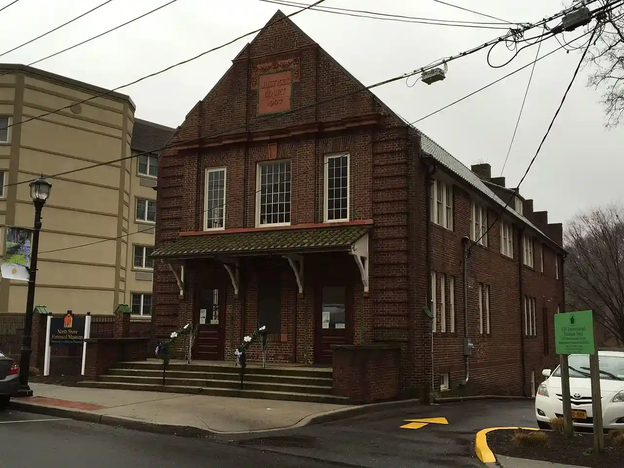 The Justice Court Building is a historic court and municipal building located in Glen Cove in Nassau County, New York. Built for the city between 1907 and 1909, it was designed by the architect Stephen F. Voorhees (1878–1965) of Eidlitz & McKenzie. The 3-story, rectangular red brick building has a steeply pitched roof covered with green clay tile. A -story rear addition was built in 1923, used for some time as a jail. It is decorated with ceramic-glazed moldings and molded terra cotta decoration and exhibits features of the Dutch Colonial Revival or Collegiate Gothic style. It features a square bell tower. The former rectory contains the museum and is a 2-story rectangular building in the Tudor Revival style. See also: Read more on Wikipedia
