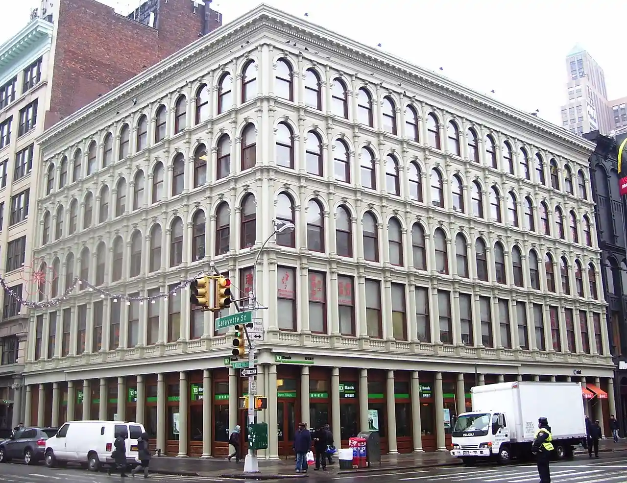 254–260 Canal Street, also known as the Bruce Building, is a building on the corner of Lafayette Street in the Chinatown neighborhood of Manhattan, New York City, United States. It was constructed in 1856–57 and designed in the Italian Renaissance revival style. The cast-iron elements of the facade may have been provided by James Bogardus, a pioneer in the use of cast iron in architecture. The building was constructed for George Bruce, a prosperous printer and inventor of new technologies in the printing industry, which was then one of New York's leading industries. It was converted to offices in 1987 by architect Jack L. Gordon. Read more on Wikipedia