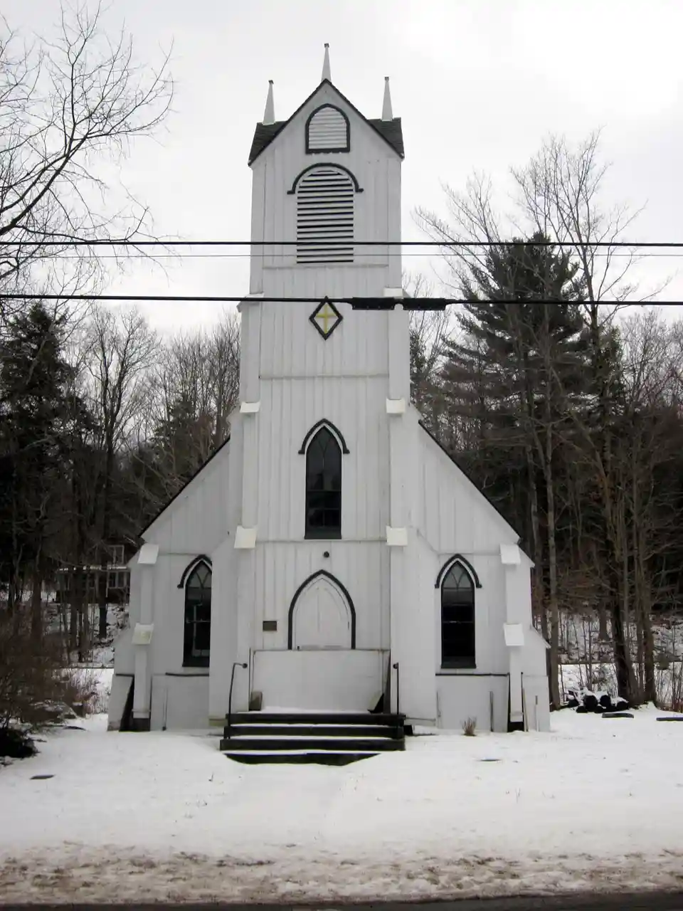 The Otter Lake Community Church, built in 1861 in Hawkinsville, New York, is now located on the east side of Route 28 in Otter Lake, Oneida County, New York. It was moved to this site in 1921. Read more on Wikipedia