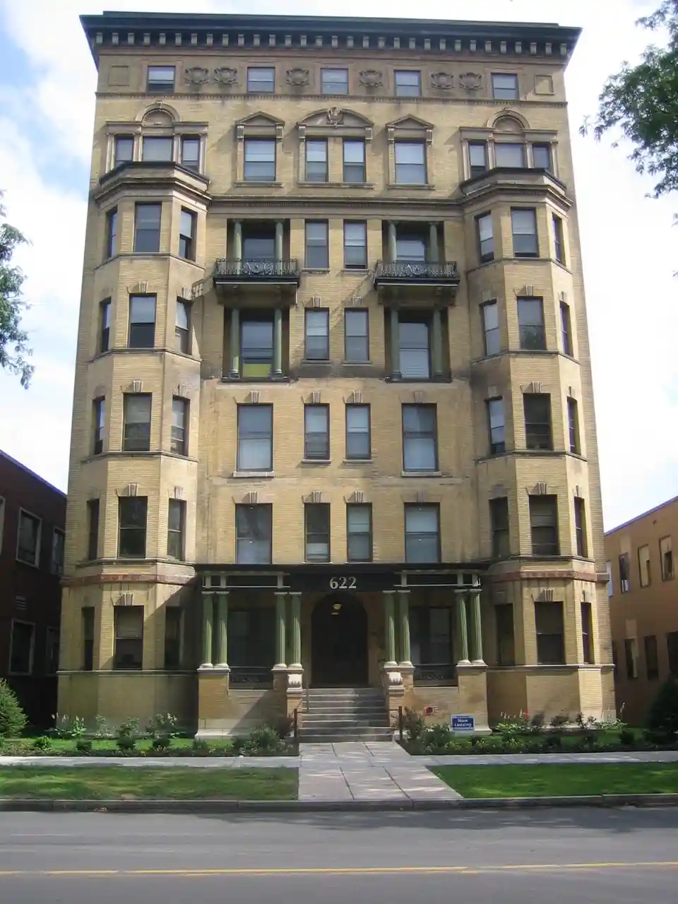 The New Kasson Apartments is a historic apartment building located on James Street in the Near Northeast neighborhood of Syracuse, Onondaga County, New York. It was designed by architectural firm of Merrick and Randall and built in 1898. It is a seven-story, Renaissance Revival style building consisting of two rectangular multi-story blocks. It is a yellow brick and limestone building with cast stone and terra cotta details. The facades features projecting three-sided bays extending from the first through fifth floors. It is located across from the Leavenworth Apartments built in 1912. Note: This includes See also: Read more on Wikipedia