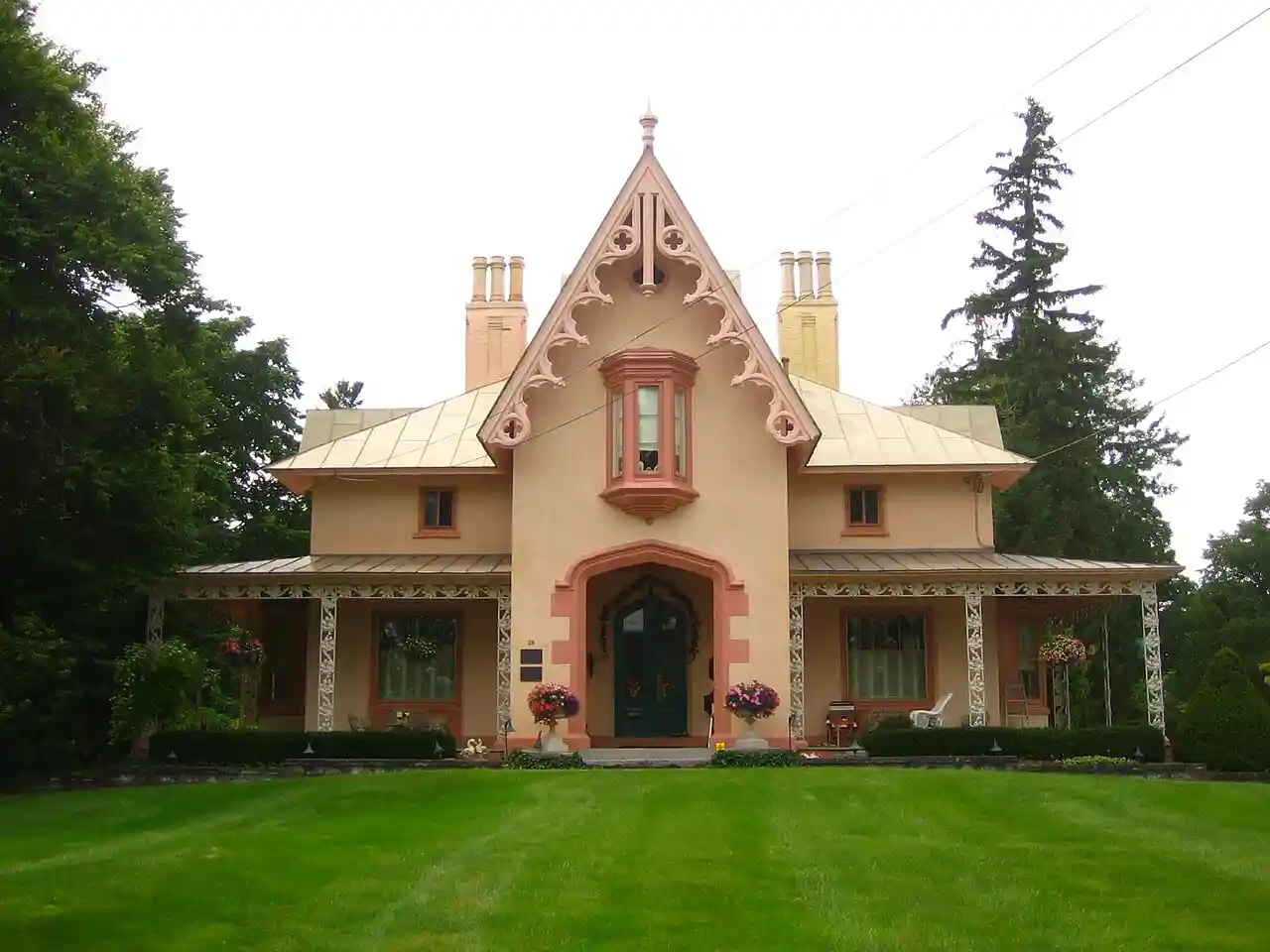 The Reuel E. Smith House (also known as The Cove, The Gingerbread House, or Cobweb Cottage) located at 28 West Lake Street in Skaneateles, New York is a picturesque house designed by Alexander Jackson Davis, and later modified by Archimedes Russell. It was built during 1848–1852 and is a "good example of the Gothic Revival mode, which was a reaction against the stringencies of the Greek Revival style" and Accompanying six photos, exterior and interior, from 1979 as exemplified by the nearby Richard DeZeng House. It is the only house designed by Davis in Onondaga County that has survived since the demolition of the Charles Sedgewick Cottage on James Street in Syracuse. Read more on Wikipedia