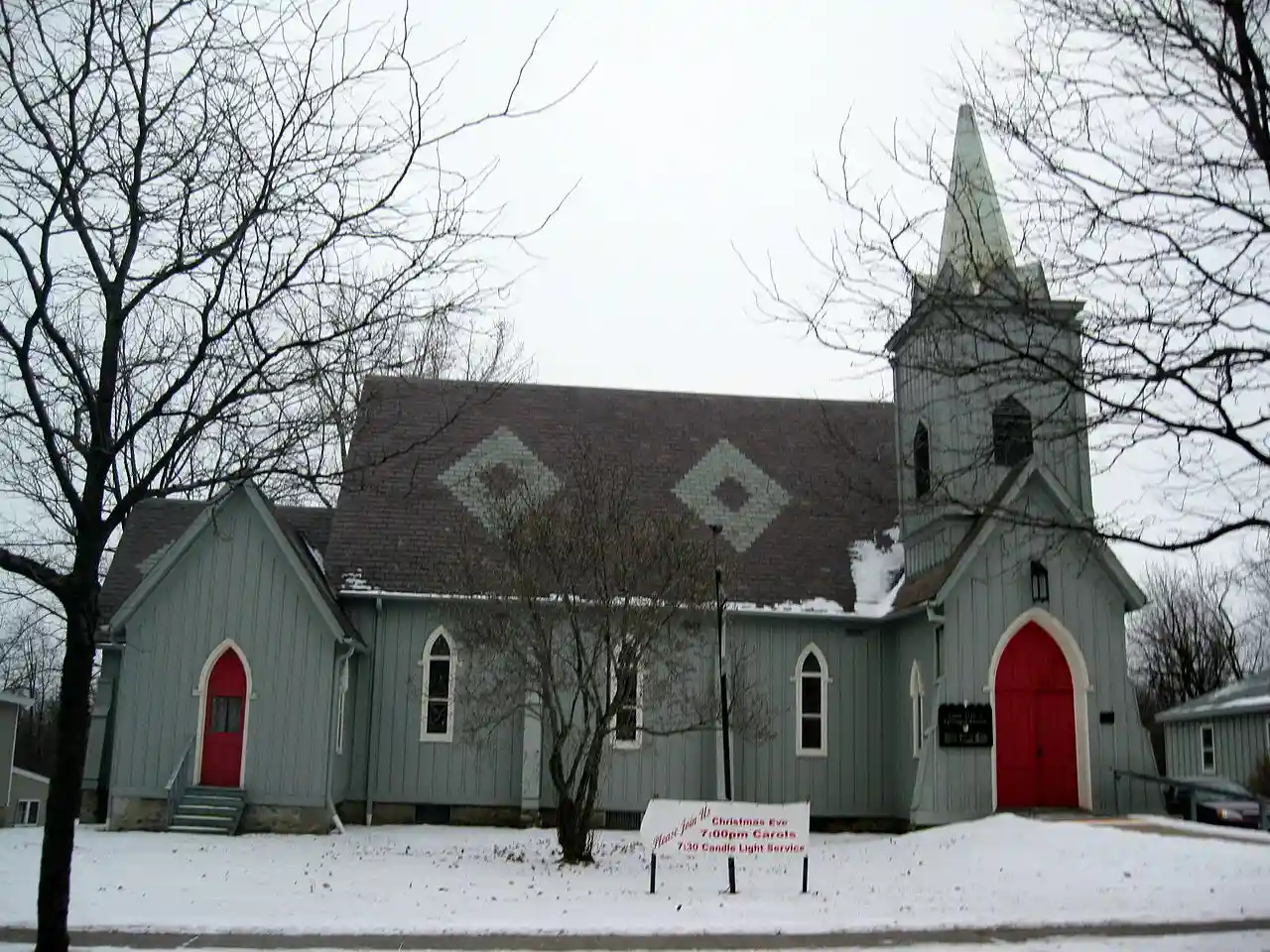 St. Peter's Episcopal Church is a historic Carpenter Gothic style Episcopal church located at 44 Main Street in Bloomfield, Ontario County, New York. Constructed in 1871, it is a small, board and batten, Carpenter Gothic style frame building. The 67 foot by 27 foot rectangular structure is surmounted by a sharply pitched gable roof featuring polychrome slate shingles set in a decorative diamond pattern. A square bell tower surmounted by a pyramidal spire is attached to the front corner of the main body of the church. See also: Read more on Wikipedia