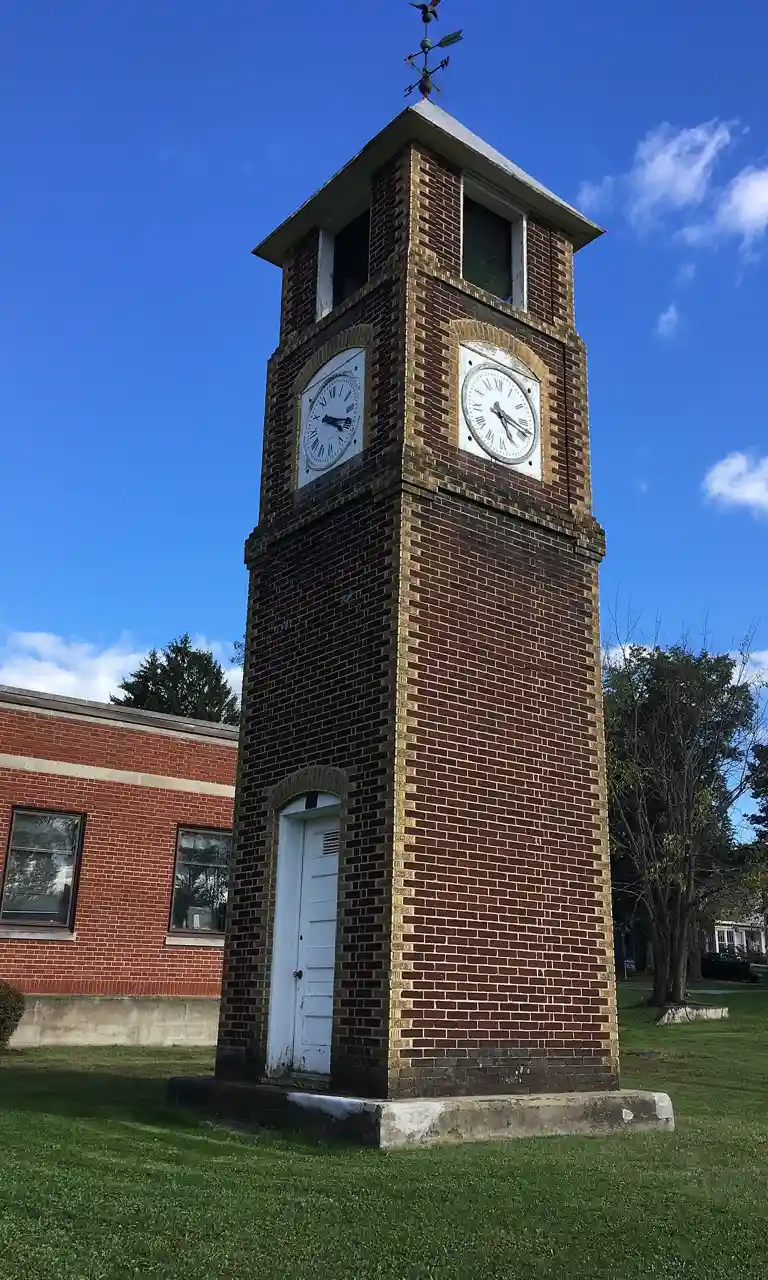 Lacona Clock Tower is a historic clock tower located at Lacona in Oswego County, New York. It was built in 1925 and is a freestanding three-tier red brick tower with a square plan and pyramidal roof. The second stage features the working electric clock and third stage a belfry containing the village bell. Read more on Wikipedia
