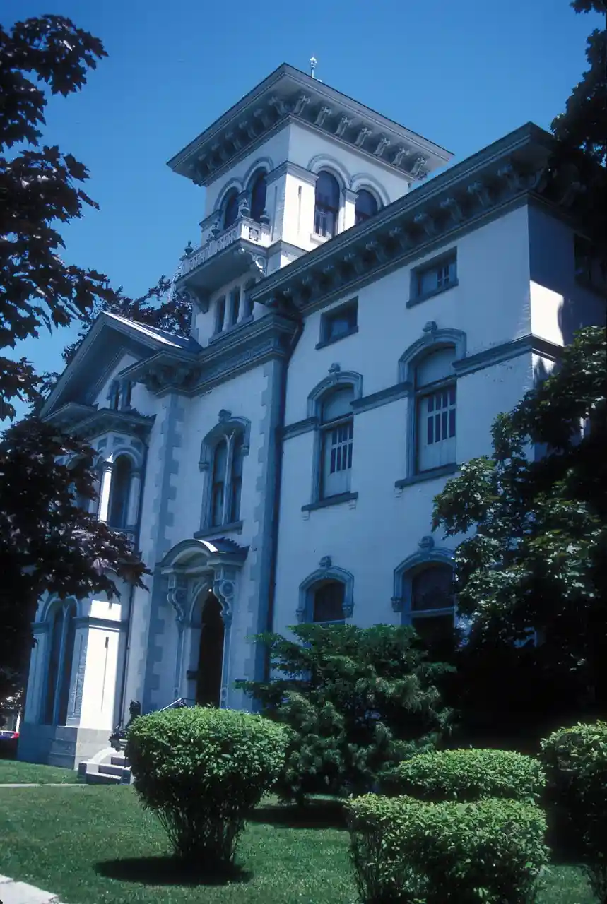 Richardson-Bates House is a historic home located at Oswego in Oswego County, New York. It is constructed primarily of brick and built in two stages. The main section is a -story, Tuscan Villa style brick residence with a gable roof and 4-story tower designed by architect Andrew Jackson Warner about 1867. The interior features carved woodwork by Louis Lavonier. The South wing addition included a private library, formal dining room and kitchen that was completed in 1889. Read more on Wikipedia
