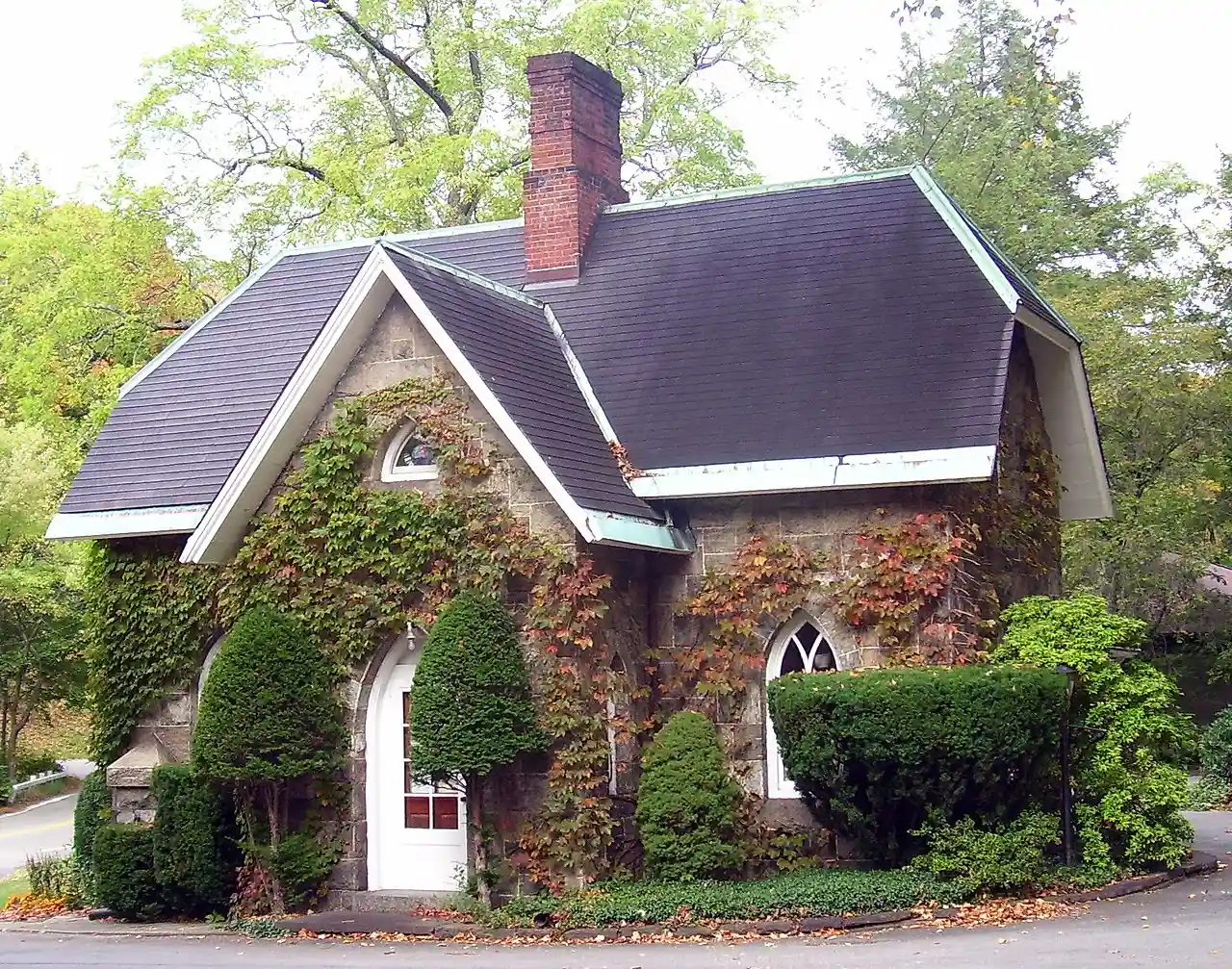 The Cold Spring Cemetery Gatehouse is located along Peekshill Road in Nelsonville, New York, United States. It is a cut granite Gothic Revival cottage built in 1863, one of the earliest uses of that style in the Hudson Highlands. It is used as a house today and was added to the National Register of Historic Places in 1982. Read more on Wikipedia