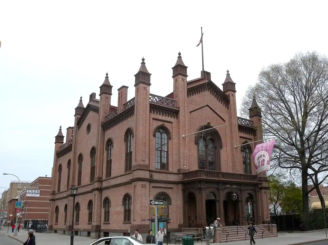 Flushing Town Hall is a historic Town Hall located on Northern Boulevard at Linden Place in the Flushing section of the New York City borough of Queens. Formerly, it served as the seat of government of the village of Flushing, established as Vlissingen in 1645, until the consolidation with New York City in 1898. It was built in 1862 and is a 2-story, three-by-six-bay, brick building with basement and attic. A style of architecture that originated in Germany, Rundbogenstil ("round arch style"), was used here and in a number of American buildings of the Civil War Era. The earliest photographs show the building to have been painted a light color. The use of paint was discontinued following adhesion problems during a restoration. A small rear wing was added in 1938 containing a block of jail cells. The front facade features a triple arched portico topped by a classic entablature with low balustrade. See also: Read more on Wikipedia