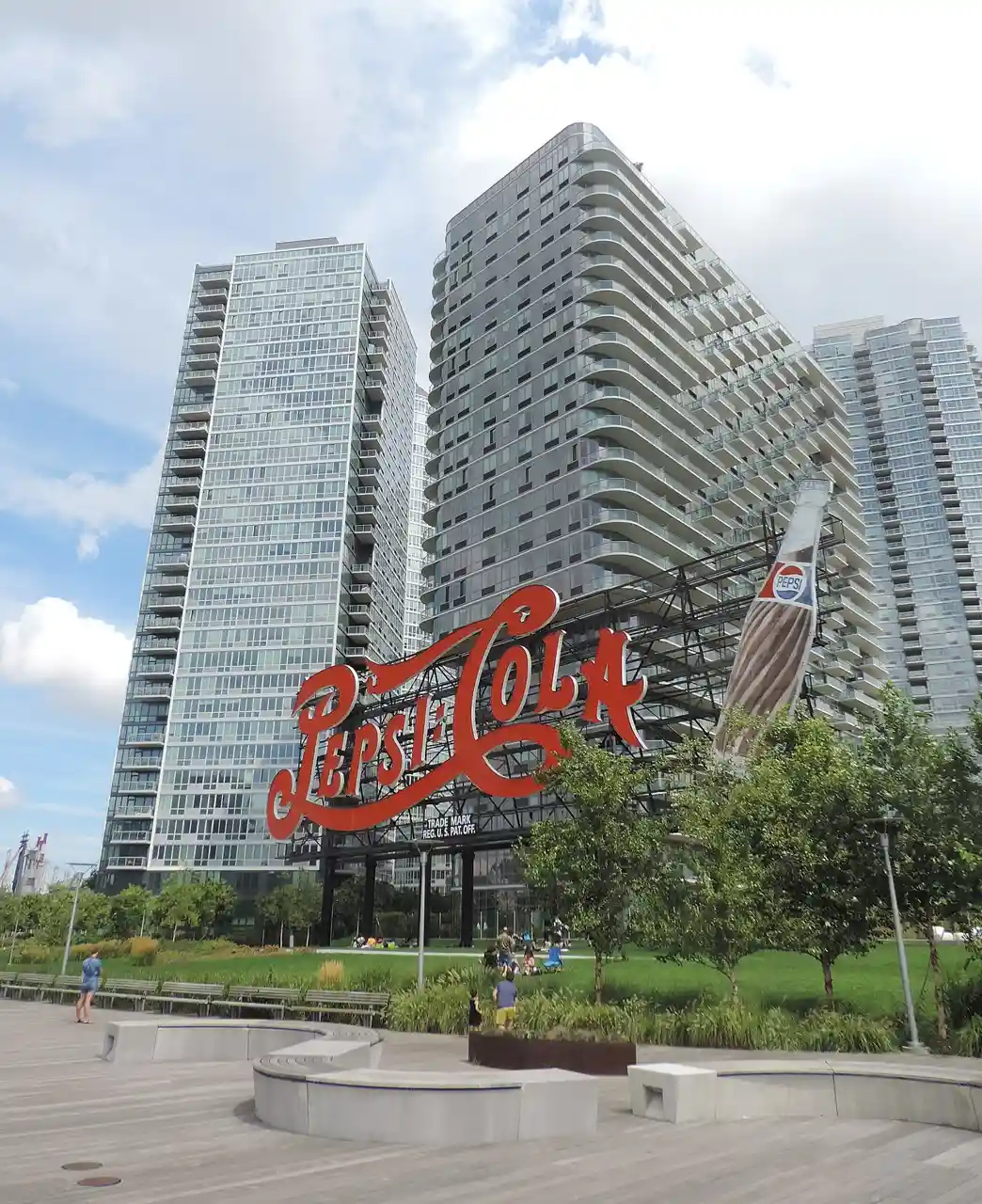 The Pepsi-Cola sign is a neon sign at Gantry Plaza State Park in the Long Island City neighborhood of Queens in New York City. The sign, visible from Manhattan and the East River, was built in 1940 and originally installed atop PepsiCo (previously Pepsi-Cola)'s bottling factory nearby. It is composed of a depiction of a Pepsi bottle, as well as lettering that reflected PepsiCo's logo when the sign was commissioned. Read more on Wikipedia