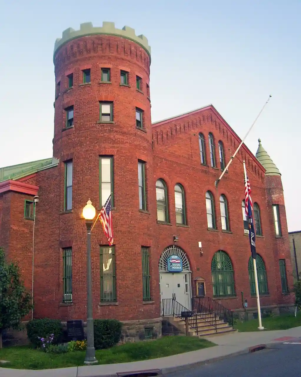 The Hoosick Falls Armory is located along Church Street (NY 22) in Hoosick Falls, New York, United States. It is a red brick building with castellated tower dating to the late 19th century. Read more on Wikipedia