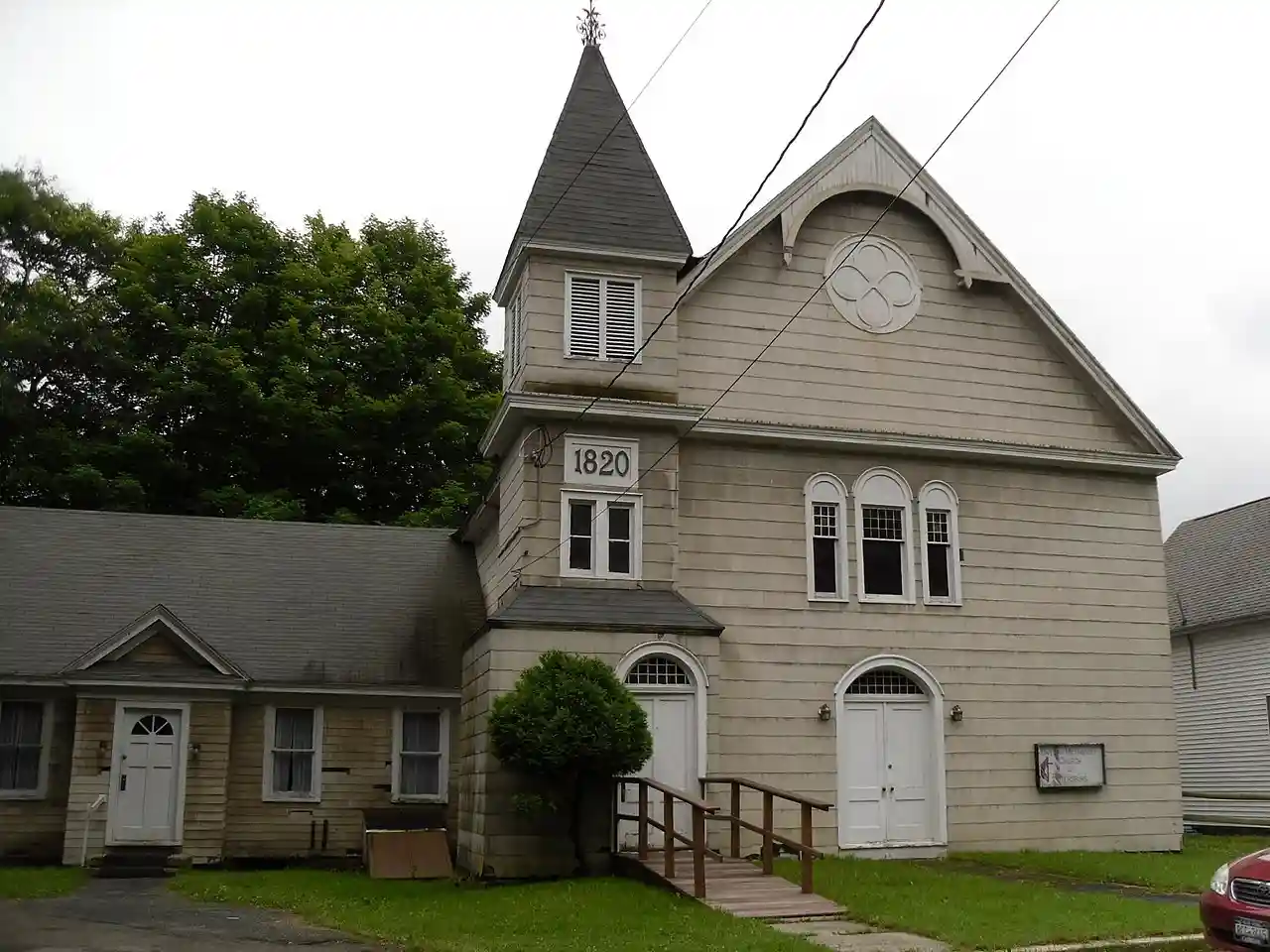 Petersburgh United Methodist Church is a historic Methodist church at 12 Head of Lane Road in Petersburgh, Rensselaer County, New York. It was originally built in 1820 and modified to its present Queen Anne style appearance in 1892. The original meeting house style building measures 48 feet long and 36 feet wide. In 1892, the 45 feet tall bell tower was added and a more steeply pitched roof was added over the original roof. An annex was completed in 1938. Note: This includes and Accompanying four photographs Read more on Wikipedia
