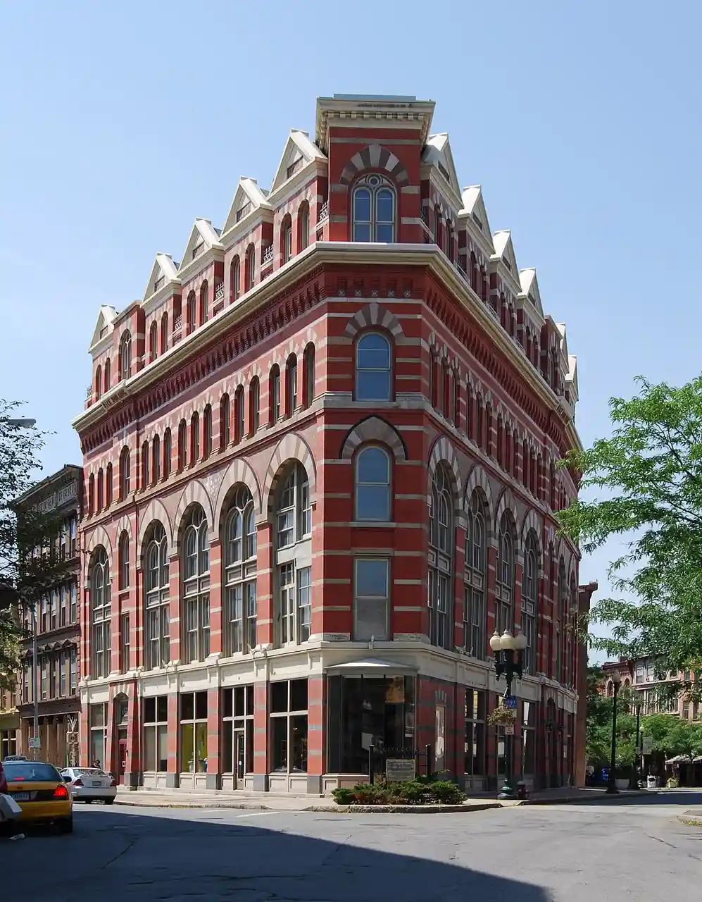 The Rice Building, originally known as the Hall Building for Benjamin Homer Hall who built it, is a triangular historic high Victorian Gothic structure with Moorish architecture window arches in Troy, New York. Built in 1871 for attorney, author, and poet Benjamin Homer Hall who served as City Clerk of Troy, it is located at 216 River Street on the corner with First Street. It has been attributed to the firm of Vaux and Withers, the partnership between Calvert Vaux and Frederick Clarke Withers after the death in a steamboat accident of Andrew Jackson Downing. More recent scholarship by a professor suggests George B. Post was the building's architect. It is part of the Central Troy Historic District. Read more on Wikipedia