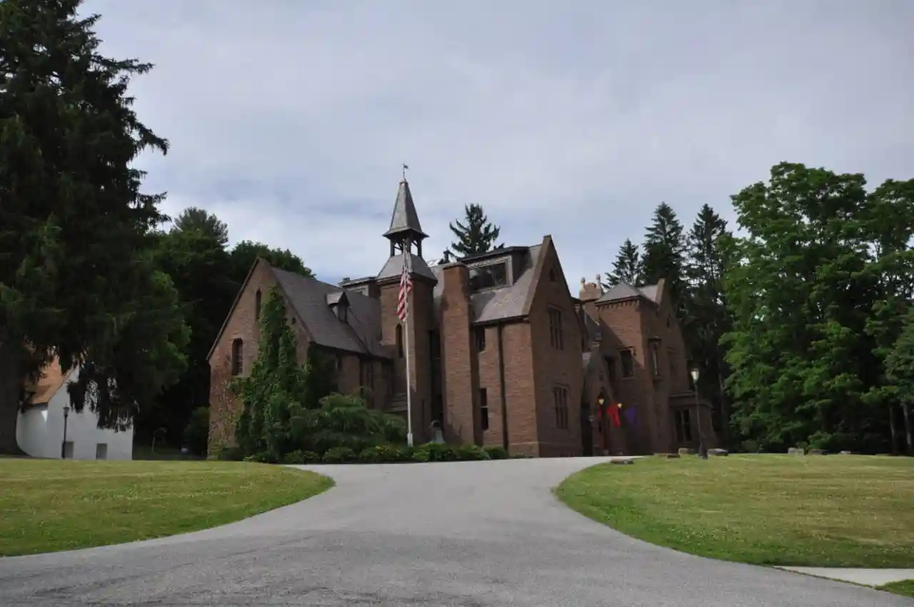 Tibbits House, also known as Tibbits Hall, is a historic home located at Hoosick in Rensselaer County, New York. The house was built about 1860 and -story, rectangular Gothic Revival–style building. It is constructed of cut ashlar sandstone blocks and has steeply pitched gable roofs covered with fishscale slate. It features projecting porches, bay windows, changes of rooflines, dormers, chimneys, and two towers. The existing house on the property was originally owned by U.S. Congressman George Tibbits (1763–1849); his son George Mortimer Tibbits (1796–1878) built the Tibbits House. At the time the property was bought by the Tibbits it was the location of a wooden house built before the Revolution by a Loyalist named Pfister. The Tibbits estate was a stop on the Underground Railroad. The building was acquired by Hoosac School in 1952 and is used as a dormitory, classrooms, and for administrative offices. See also: Read more on Wikipedia