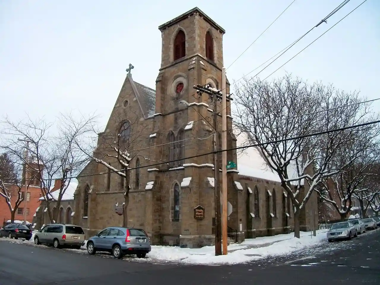 Trinity Church Lansingburgh is a historic Episcopal church complex located at 585 Fourth Avenue in Troy, New York. The complex consists of the Gothic Revival style stone church (1869) designed by architect Henry C. Dudley, a Greek Revival style brick rectory (c. 1844), brick parish hall (1930), cemetery (1807) with approximately 240 graves, and a wrought iron fence (1901). Note: This includes and Accompanying photographs Read more on Wikipedia