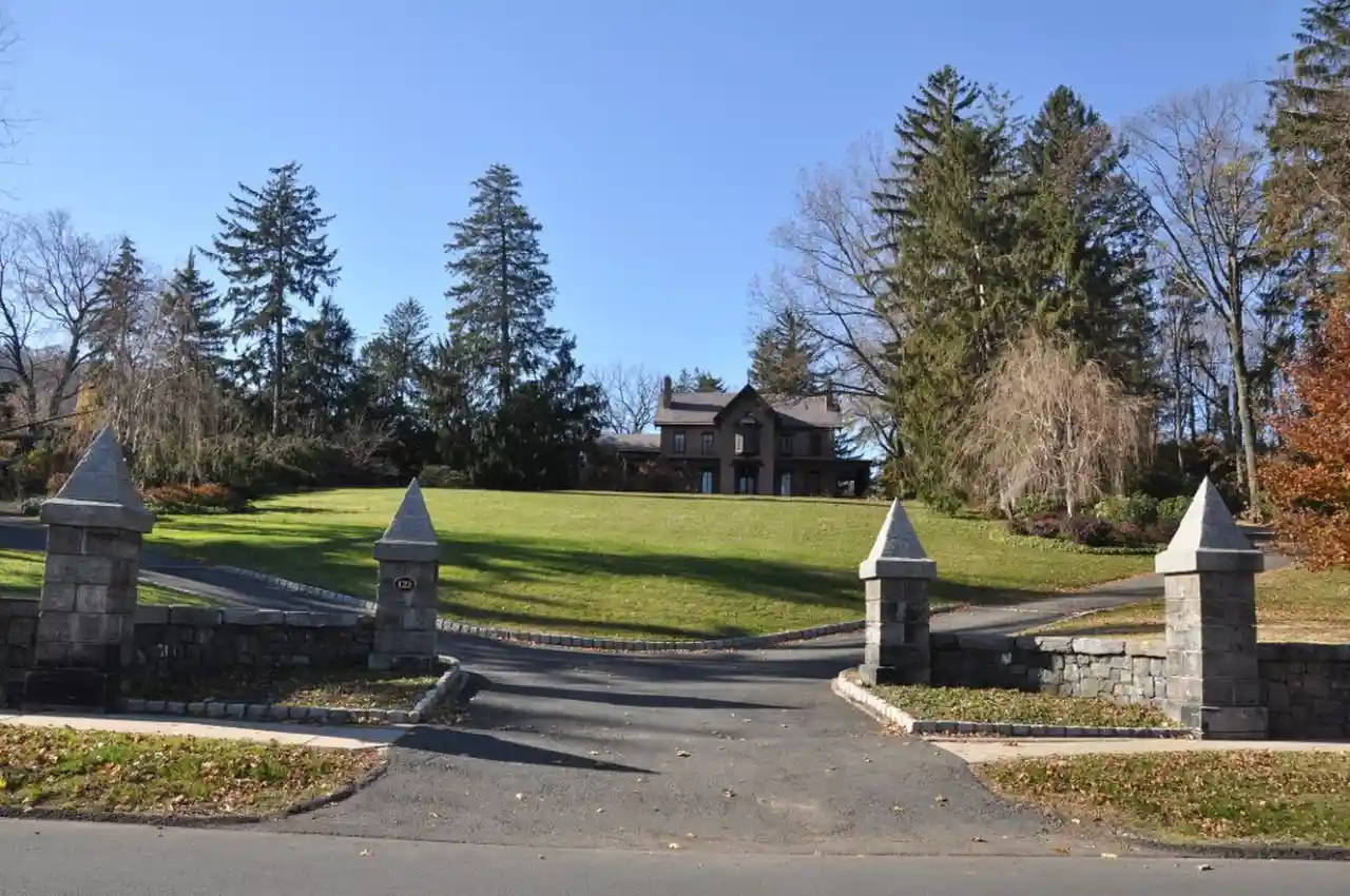 Ross-Hand Mansion is a historic home located at South Nyack in Rockland County, New York. The land was acquired from the Tallman family in 1856 by Azariah Ross (1787-1878). Ross was a veteran of the War of 1812 and a successful New York City property developer. He was a longtime resident of Rockland County, having moved there in about 1820. The design of the Mansion is closely based on a design for 'A Country House in the Pointed Style' from the Architecture of Country Houses: including designs for cottages, farm-houses, and villas, with remarks on interiors, furniture, and the best modes of warming and ventilating by the great landscape designer and architect Andrew Jackson Downing. The three-story brick mansion with Gothic Revival style features was completed in 1859. It features ornamental bargeboards and a steeply pitched gable roof. Read more on Wikipedia
