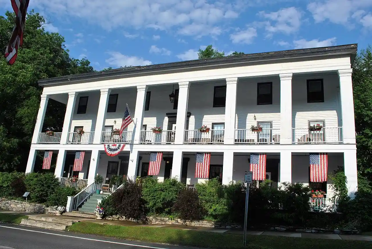 American Hotel is a historic hotel located at Sharon Springs in Schoharie County, New York. It is a large, -story wood-frame structure built between 1847 and 1851 in the Greek Revival style. It features a recessed 2-story porch with a colonnade of eight pillars with Doric order capitals supporting the roof. It is located within the Sharon Springs Historic District. See also: Read more on Wikipedia