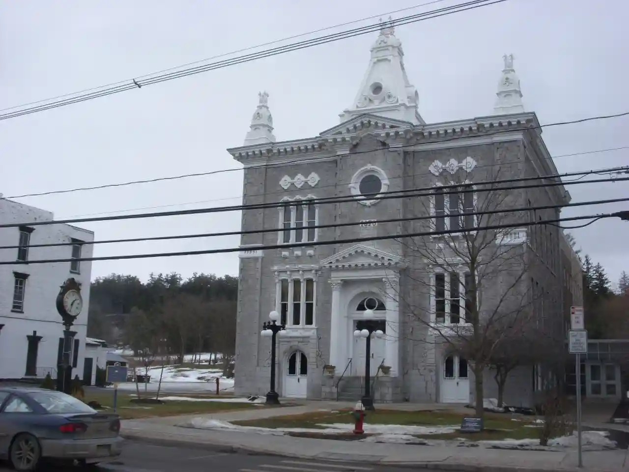 Schoharie County Courthouse Complex is a historic courthouse and county clerk's building located at Schoharie in Schoharie County, New York. The courthouse building was built in 1870 and is a two-story structure above a raised basement structure built of cut limestone block laid random ashlar. It features a shallow hipped roof surmounted by an ornate pyramidal cupola and corner turrets of pressed metal. The county clerk's building is a two-story, hip-roofed, rectangular stone building built of random ashlar limestone in 1914. See also: Read more on Wikipedia