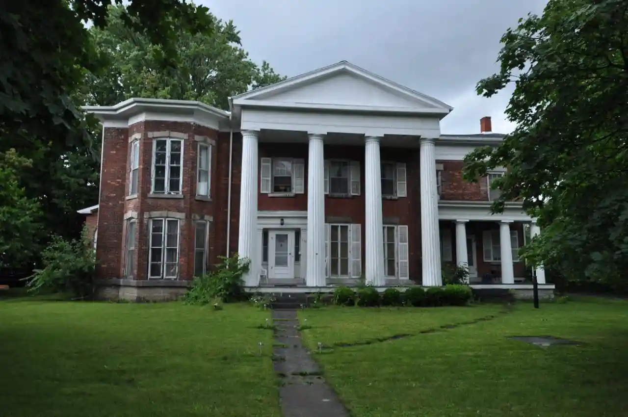 James Russell Webster House is a historic home located at Waterloo in Seneca County, New York. It is a temple front Greek Revival style residence. When built in 1850-1855 it featured a two-story, three-bay, side hall main block flanked by two symmetrical one story, three-bay center hall wings. In the 1870s, a veneer of Italianate details were added during and expansion and modernization. The expansion included adding a second story to each side wing. The front facade features a pedimented portico supported by four Doric order columns.See also: Read more on Wikipedia