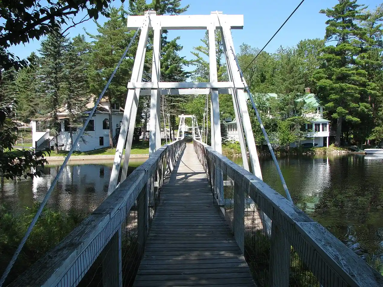 The Wanakena Footbridge was a pedestrian suspension bridge located at Wanakena in St. Lawrence County, New York. It was constructed in 1902 and spanned the Oswegatchie River. It was originally constructed to provide a crossing for the employees of the Rich Lumber Company to reach the no longer extant mills. See also: Read more on Wikipedia