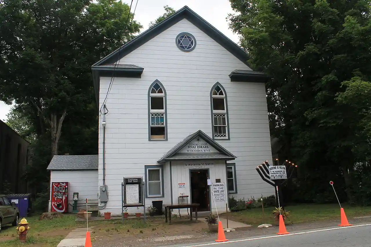 B'nai Israel Synagogue is a historic synagogue on NY 52 in Woodbourne, Town of Fallsburg, Sullivan County, New York. The first rabbi of the synagogue was David Isaac Godlin (1868-1943). It was built in 1920 and is a two-story building above a shallow concrete basement. It is a wood-frame structure, three bays wide by four bays deep and surmounted by a steep gable roof with deep wooden cornice. See also: Read more on Wikipedia