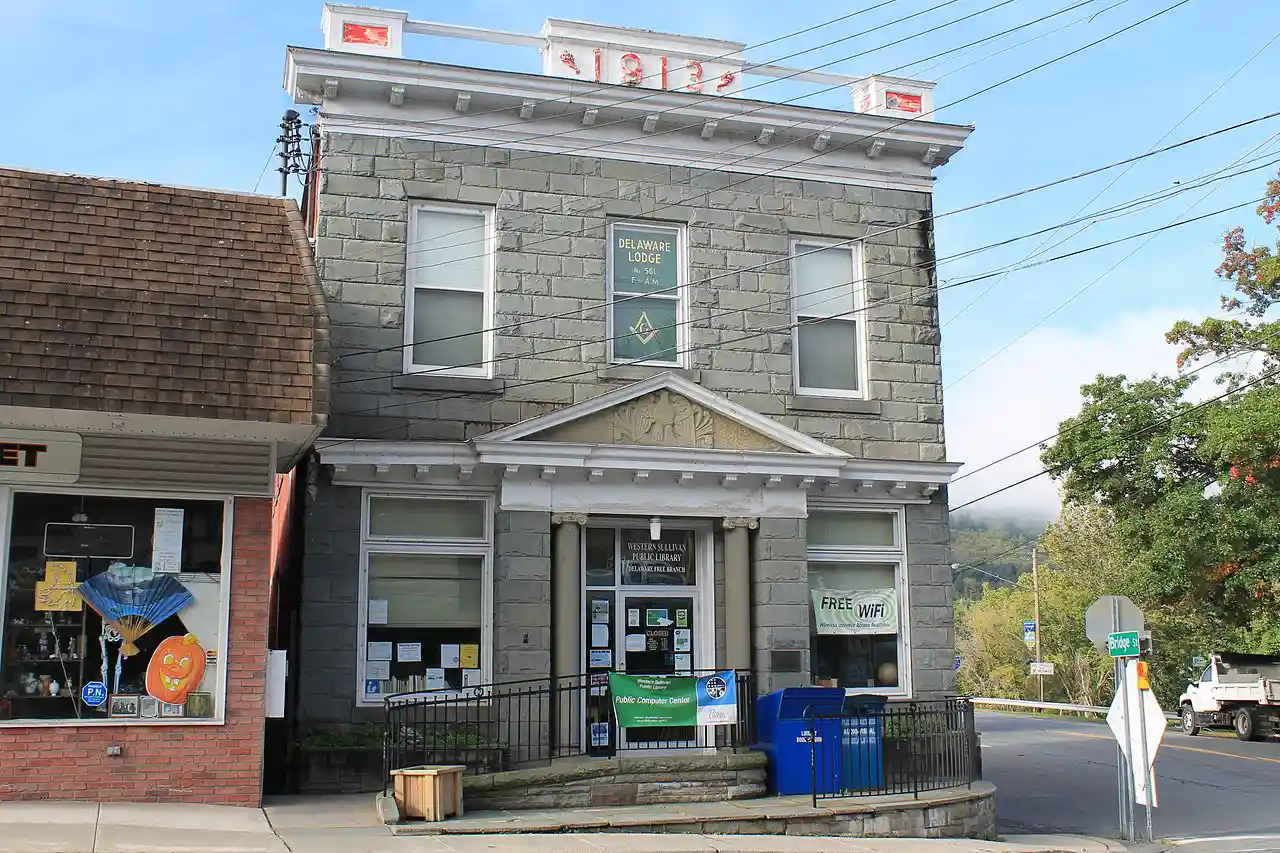 Callicoon National Bank, also known as Delaware Free Library, is a historic bank building located at Callicoon in Sullivan County, New York. It was built in 1913 and is a two-story masonry building, rectangular in plan with a flat roof. The symmetrical bluestone facade features a pedimented entrance with Ionic order columns in antis. A bank occupied the building until 1967; in 1970 it was occupied by the library. See also: Read more on Wikipedia