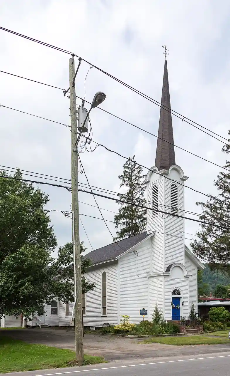 Roscoe Presbyterian Church and Westfield Flats Cemetery is a historic Presbyterian church and cemetery on Old NY 17 in Roscoe, Sullivan County, New York. The church was built about 1884 and is a simple rectangular wood-frame building, three bays wide and three bays deep, with a large rear cross-gabled wing. It features a narrow, engaged, center entrance tower surmounted by a spire. The cemetery contains about 200 burials, with the earliest dating to the first decade of the 19th century. See also: Read more on Wikipedia