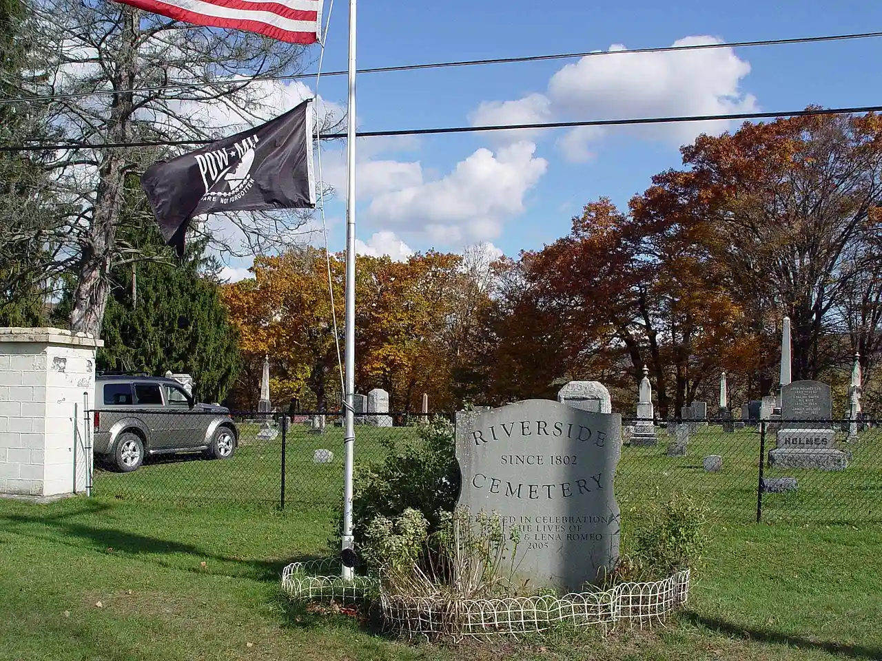Riverside Cemetery is a historic cemetery located near Apalachin in Tioga County, New York. It was established in 1802, with late-19th century additions and an addition in 1939. It remains an active burial ground containing approximately 3,600 burials. It is the final resting place of many early settlers of the region. A set of stone entrance gates were installed in 1939. Notable burials include May Louise Davison Purple (1871-1957), wife of author Eugene Manlove Rhodes. Note: This includes and Accompanying photographs Read more on Wikipedia