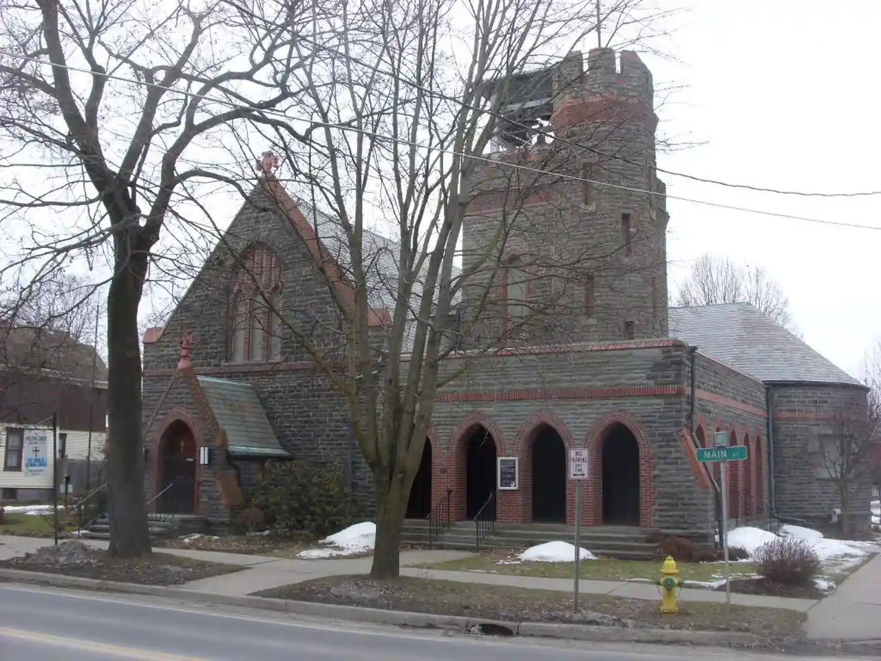 St. Paul's Church is a historic Episcopal church located at Owego in Tioga County, New York. It is a High Victorian Gothic style structure built of rough cut bluestone trimmed with orange brick and terra cotta. The church is composed of a small entry vestibule, the gabled main block housing the nave and chancel, a shallow transept lying opposite a semicircular Lady Chapel, a tower, and an arcaded porch and a sacristy. It was designed by architect William Halsey Wood (1855–1897) and was built in 1893–1894. See also: Read more on Wikipedia
