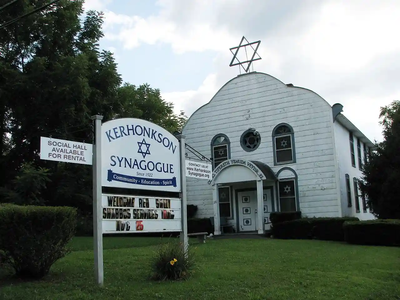 Congregation Tifereth Yehuda Veyisroel, also known as the Kerhonkson Synagogue, is a historic synagogue located at Kerhonkson, Ulster County, New York. It was built in 1924, and is a one-story, rectangular, wood-frame building with a gable roof with overhanging eaves. It sits on a concrete covered stone basement and is clad in stucco on three sides. The front facade has a false front that extends above the roof with three curves surmounted by a Star of David. Also on the property is the contributing Community House (c. 1954). It was built to serve Jewish merchants and farmers in the Kerhonkson area and is one of 20 intact early 20th-century Catskill synagogues. Note: This includes Read more on Wikipedia