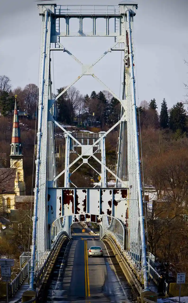 The Kingston–Port Ewen Suspension Bridge, sometimes known as the "Rondout Creek bridge", "Old Bridge" or "Wurts Street Bridge", is a steel suspension bridge spanning Rondout Creek, near where it empties into the Hudson River. It connects the City of Kingston to the north, with the village of Port Ewen to the south. Completed in 1921, it was the final link in New York's first north-south highway on the West Shore of the Hudson, and is considered an important engineering accomplishment associated with the development of early motoring. Read more on Wikipedia