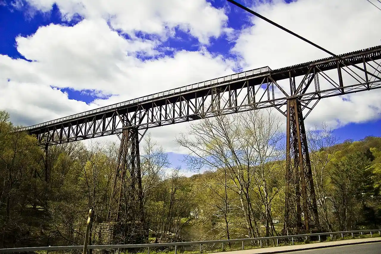 The Rosendale Trestle is a continuous truss bridge and former railroad trestle in Rosendale Village, a hamlet in the town of Rosendale in Ulster County, New York. Originally constructed by the Wallkill Valley Railroad to continue its rail line from New Paltz to Kingston, the bridge rises above Rondout Creek, spanning both Route 213 and the former Delaware and Hudson Canal. Construction on the trestle began in late 1870, and continued until early 1872. When it opened to rail traffic on April 6, 1872, the Rosendale trestle was the highest span bridge in the United States. Read more on Wikipedia