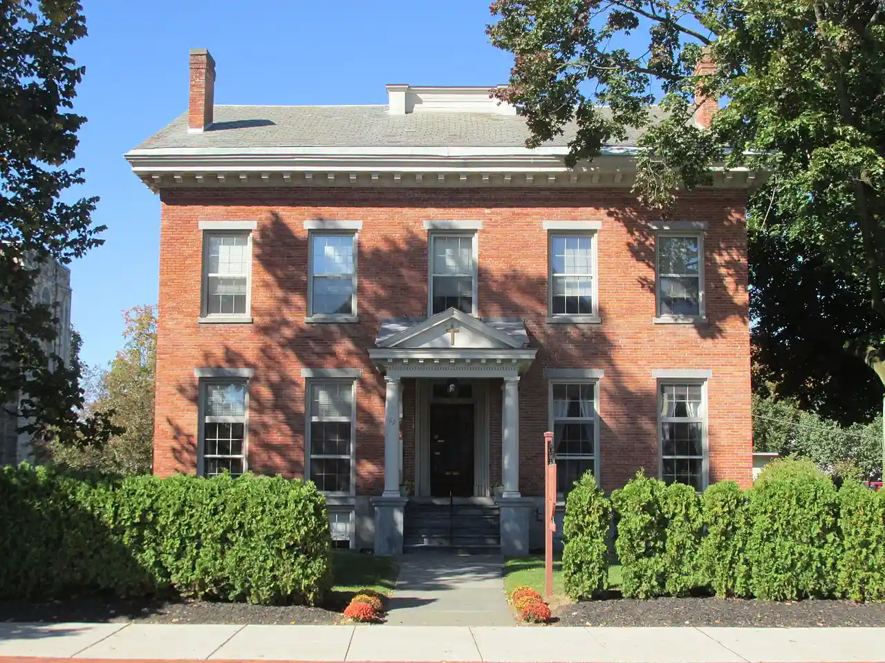 Enoch Rosekrans House is a historic home located at Glens Falls, Warren County, New York. It was built about 1855 and is a rectangular -story brick residence that incorporates transitional vernacular Greek Revival / Italianate style design elements. It features a five-bay facade with central entrance sheltered by a portico with pediment and denticulated cornice. Read more on Wikipedia