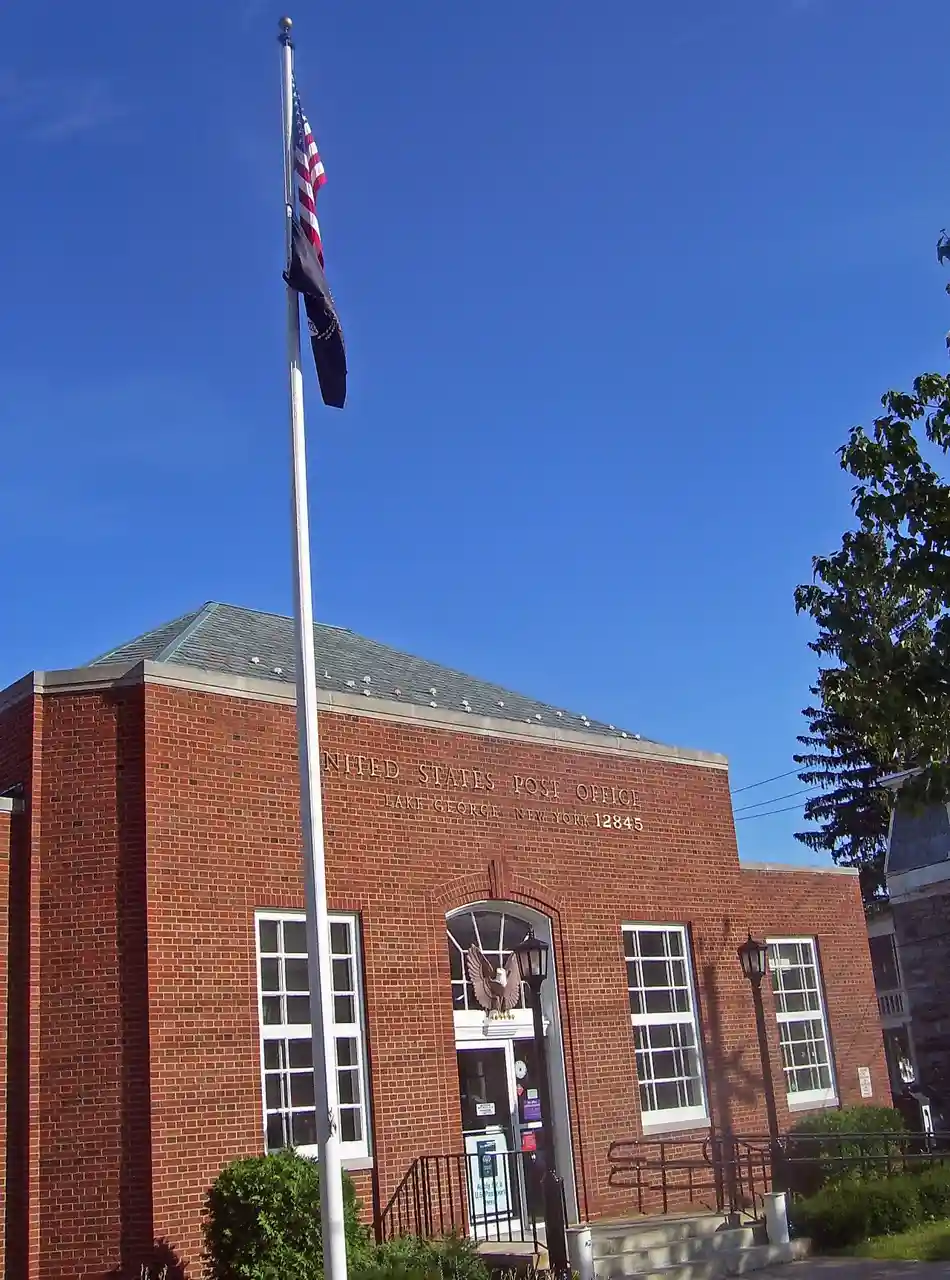 The U.S. Post Office in Lake George, New York, United States, is located at the corner of Canada Street (US 9/NY 9N) and Kurosaka Lane (formerly James Street). It is a small brick building constructed just before World War II. It serves the area the village of Lake George, the surrounding town and those areas of Queensbury which comprise the 12845 ZIP Code. Read more on Wikipedia