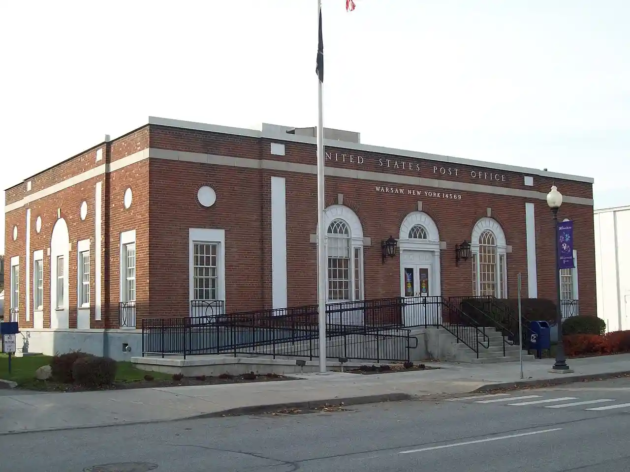 US Post Office-Warsaw is a historic post office building located at Warsaw in Wyoming County, New York. It was designed and built in 1934-1935 as a Works Progress Administration project, and is one of a number of post offices in New York State designed by the Office of the Supervising Architect of the Treasury Department, Louis A. Simon. It is a one-story, five bay steel frame brick structure on a raised reinforced concrete foundation in the Colonial Revival style. See also: Read more on Wikipedia