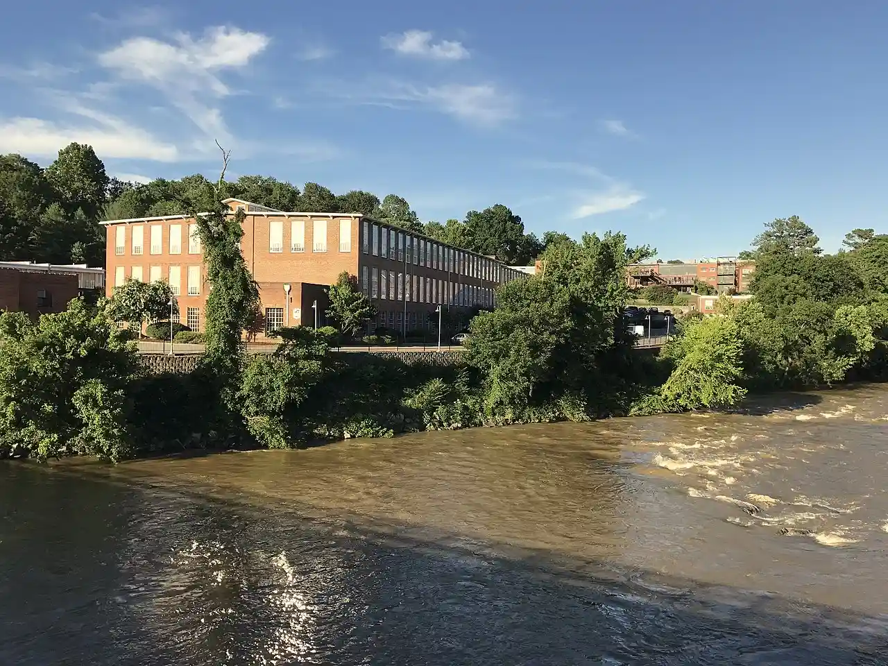 Former Saxapahaw Spinning Mill is a former textile mill building located at Saxapahaw, Alamance County, North Carolina. It was built between 1906 and 1938, and is a three-story, augmented L-shaped brick, heavy timber and steel building. It was later expanded in the 1940s and 1950s. The former power house was built about 1880, and is a small rectangular, brick, side-gabled building. The Saxapahaw Mill operated for almost 150 years until Dixie Yarns, owners from 1978 to 1995, closed its doors in 1994. Read more on Wikipedia