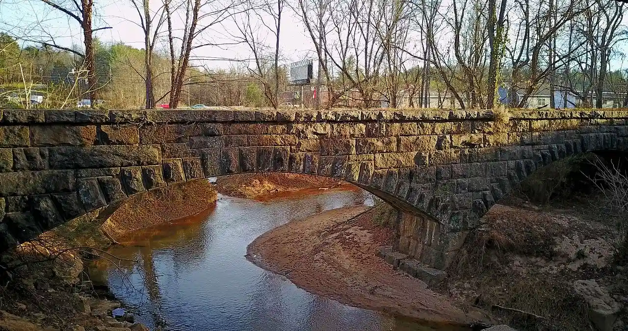 Hunting Creek Railroad Bridge is a historic stone railroad bridge located at Morganton, Burke County, North Carolina. It was built about 1860, and is a two-span, stone arch bridge. It measures 130 feet long and stands about 24 feet above the creek. It was replaced by another bridge by at least 1890. Read more on Wikipedia