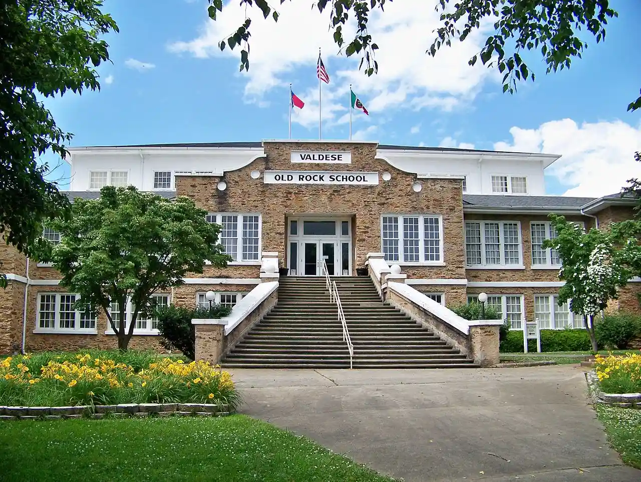 Valdese Elementary School, also known as the Old Rock School, is a historic school building located at Valdese, Burke County, North Carolina. It was built in 1922–1923, and is a two-story, fieldstone four square building with a hipped roof. It features a T-shaped clerestory above the auditorium space. It was constructed largely by Waldensian settlers from Northern Italy. Read more on Wikipedia