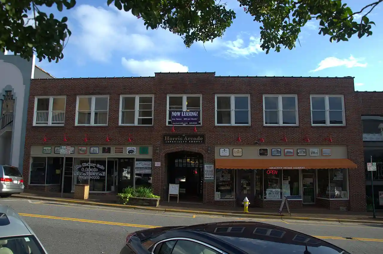 Harris Arcade, also known as the Arcade Building, is a historic commercial building located at Hickory, Catawba County, North Carolina. It was built in 1938, and is a two-story, brick Commercial Style building, with Tudor Revival-Style arched arcade openings. It features an eight-foot wide arcade passage with a broken-tile terrazzo floor and intact late-interwar period commercial space. Read more on Wikipedia