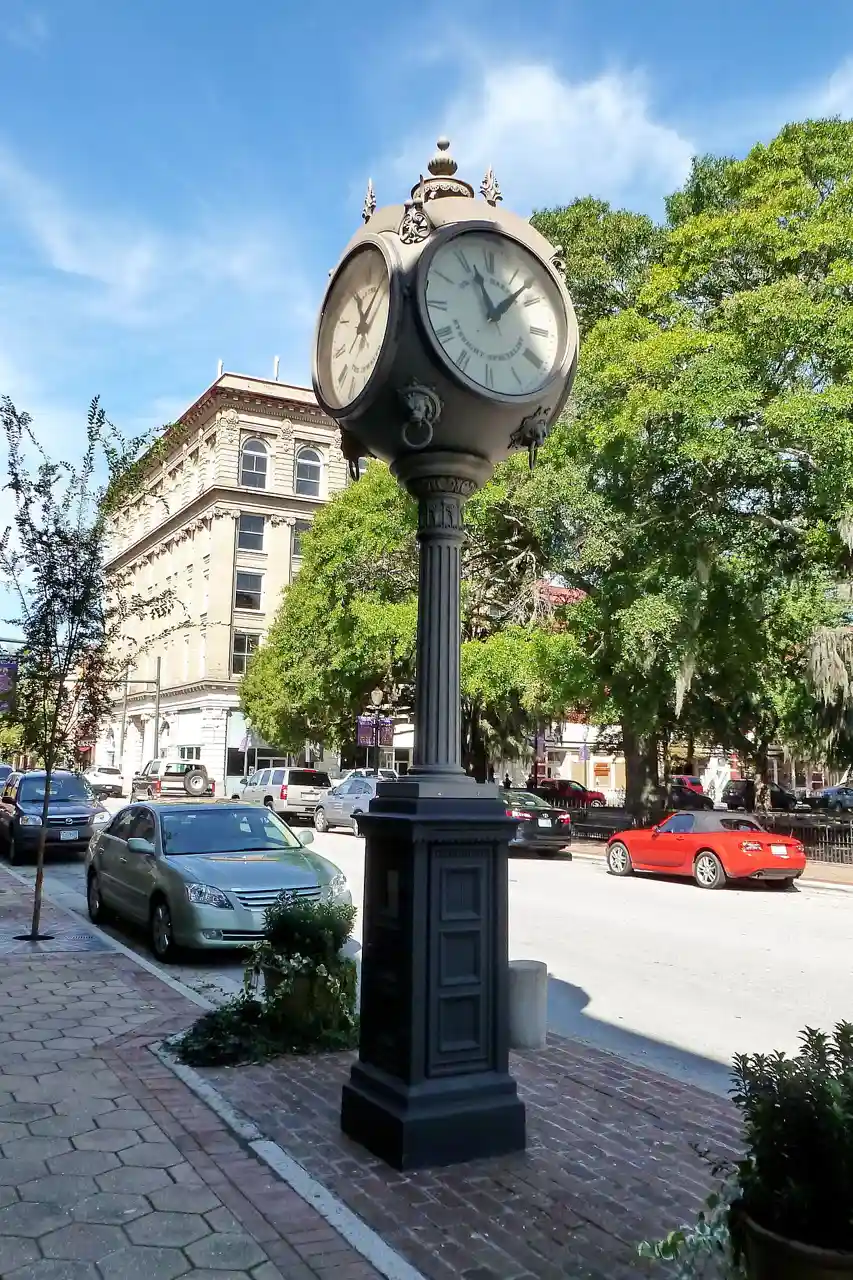 Baxter Clock is a historic street clock located in New Bern, North Carolina. It was manufactured in 1920 by the Seth Thomas Clock Company, and erected in 1930 opposite the front entrance of Baxter's Jewelry Store. The four-sided clock has brass and steel works contained in a spherical cast iron case which consists of three stages. It was listed on the National Register of Historic Places (NRHP) in 1973, but in 1977, an accident resulted in the broken clock being placed in storage for almost fourteen years. The Baxter Clock is thought to be one of three operating clocks of its kind remaining in the country. Read more on Wikipedia
