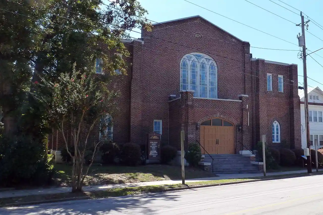 St. Peter's AME Zion Church is a historic African Methodist Episcopal church located at 615 Queen Street in New Bern, Craven County, North Carolina. It was built between 1923 and 1942, on the site of the 1914 church building which was destroyed by fire in 1922. It is a large three bay by seven bay, rectangular brick church building in the Late Gothic Revival style. It features a gabled nave flanked by two-story truncated stair towers. Also on the property is the contributing 1926 parsonage; a -story, frame American Craftsman style dwelling. It is known within the denomination as the "Mother Church of Zion Methodism in the South," and the oldest existing African Methodist Episcopal congregation in the South. Read more on Wikipedia