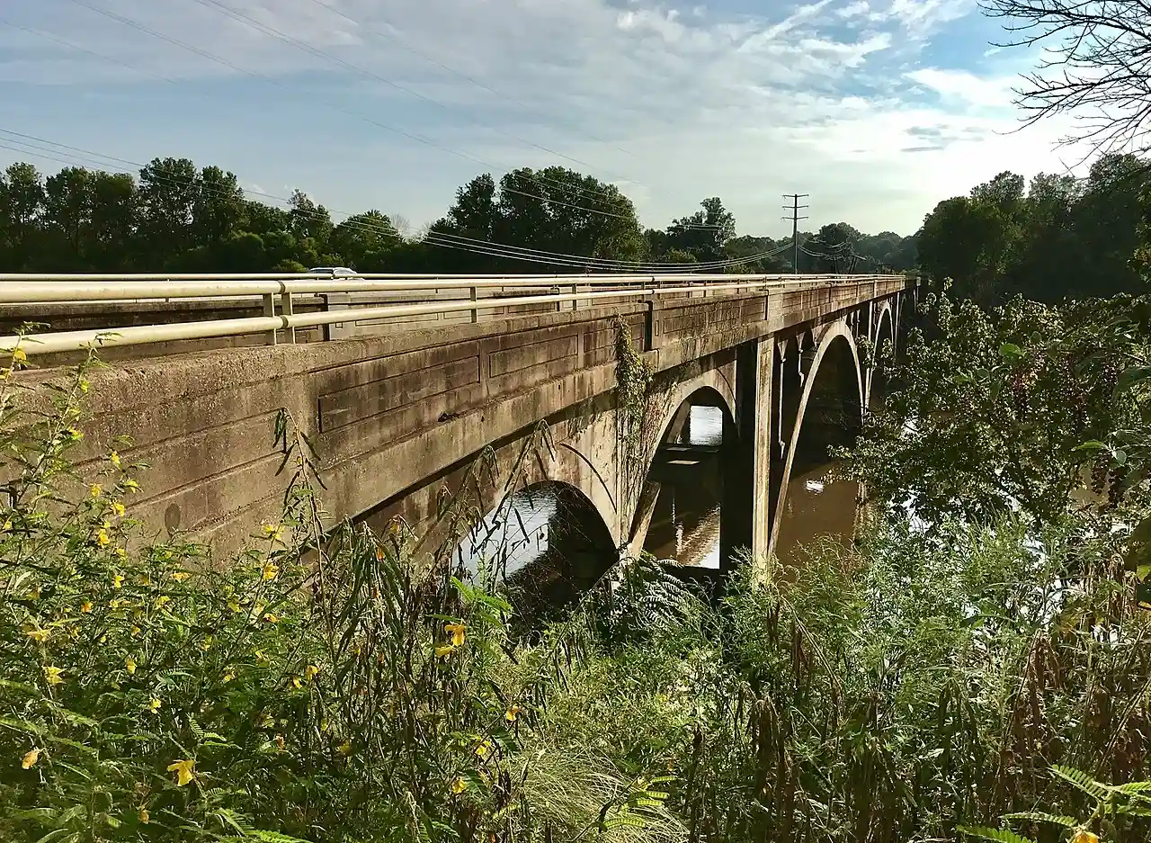 The Wil-Cox Bridge is a historic concrete arch pedestrian bridge spanning the Yadkin River between Rowan and Davidson counties in North Carolina. The bridge formerly carried two lanes of US 29/US 70/NC 150, but is now part of the Davidson County Greenway system and Yadkin River Park. Read more on Wikipedia