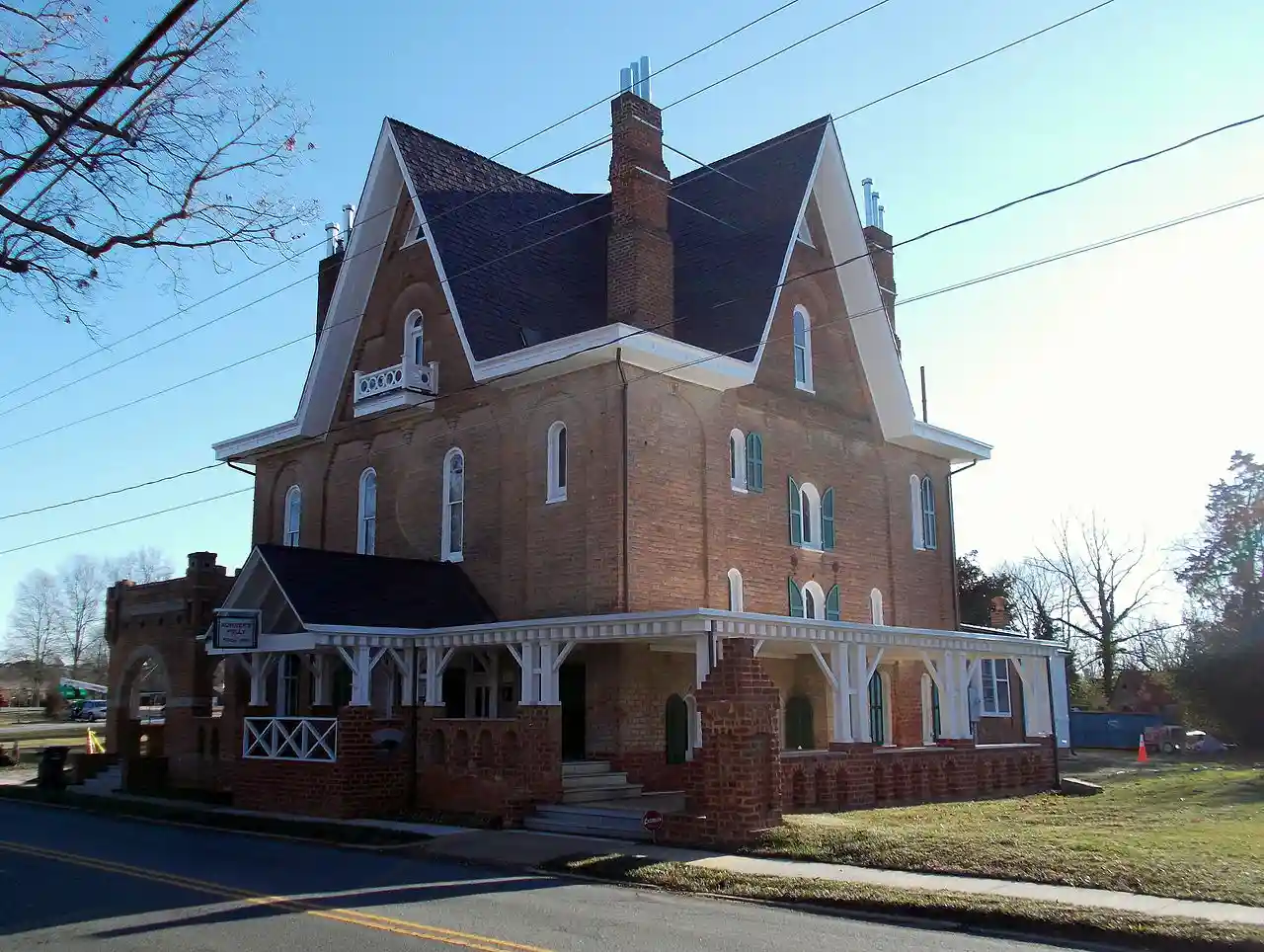 Körner's Folly is a historic home located at Kernersville, Forsyth County, North Carolina. It was built in 1880 by Jule Gilmer Körner, and is a 6,000 square foot, -story, eccentric brick dwelling with a shingled, cross-gable roof. It measures 48 feet on each side, with four bays. The house is said to have served originally as combination dwelling, stable, and carriage house, and featured an open carriageway running through the center of the house. Körner made his fortune by spearheading one of the first national advertising campaigns by painting murals of Bull Durham Smoking tobacco bulls on buildings and barns across the American east coast. In the 1870s he moved back to his hometown Kernersville, NC, to build Körner's Folly and start an interior decorating and design business. After marrying Polly Alice Masten and having two children, Gilmer and Dore, Körner closed the carriageway and renovated the house to its present floor plan. The 22-room interior features unusual architecture and many examples of Victorian furniture and interior decoration since Körner used the house to showcase his business. Also on the property is a brick outbuilding – a small-scale version of the main house – which functioned as the "privy." Read more on Wikipedia