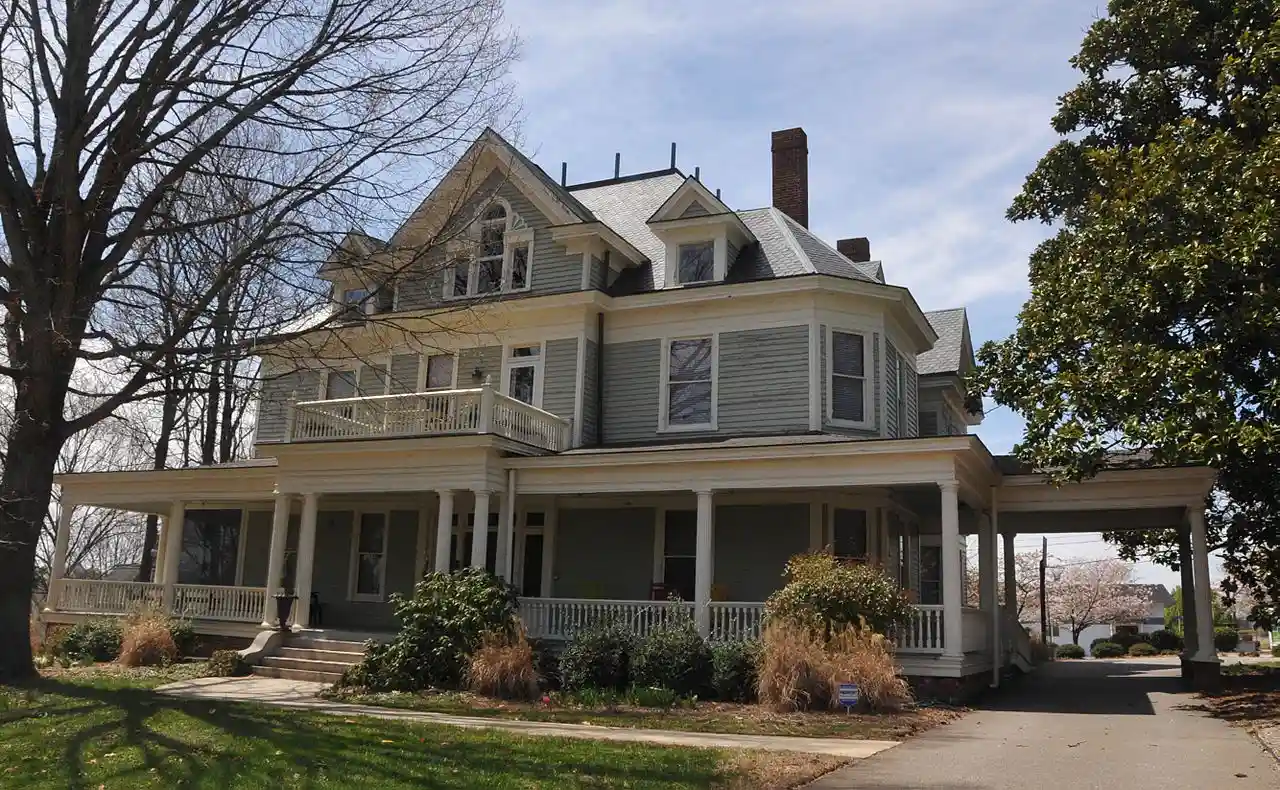 William Allen Blair House is a historic home located at Winston-Salem, Forsyth County, North Carolina. It was built in 1901, and is a two-story, Colonial Revival style frame dwelling. It has a one-story, wrap-around front porch and Porte-cochère. The house features a high hipped roof with gabled dormers and central facade gable with a projecting second story bay and a Palladian window. Read more on Wikipedia