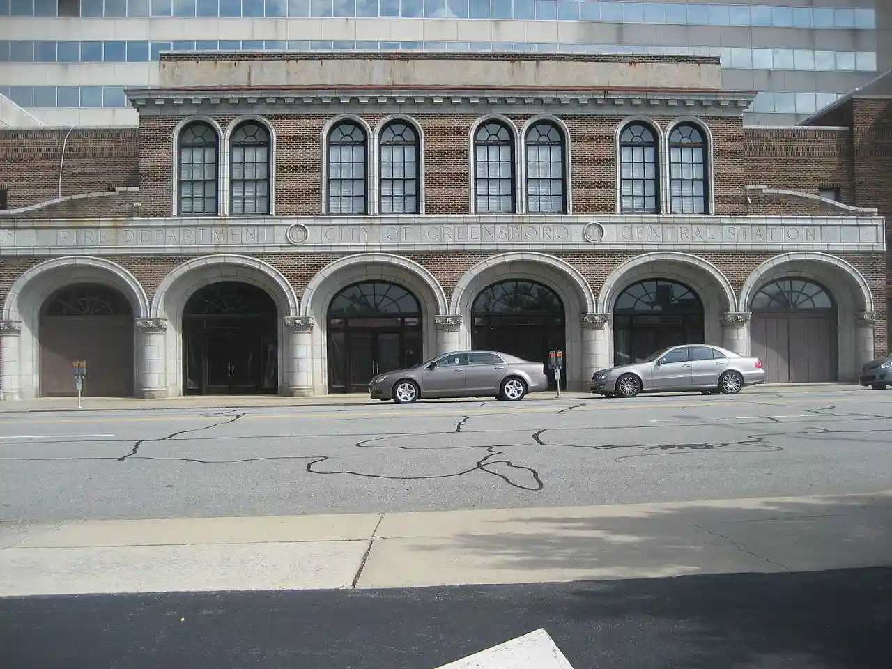 Central Fire Station is a historic fire station located at Greensboro, Guilford County, North Carolina. It was designed by architect Charles C. Hartmann and built in 1925–1926. It is a two-story, red brick building with carved granite ornamentation in the Renaissance Revival building. It is nine bays wide and has a six bay wide stepped and projecting pavilion with flattened arches and attached granite columns. The building once had a six-story tower, removed in the early-1950s. Read more on Wikipedia