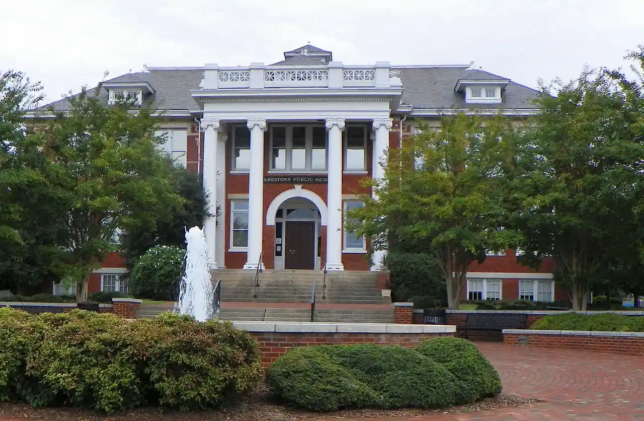 Jamestown High School, Former, also known as Jamestown Public School, is a historic school building located at Jamestown, Guilford County, North Carolina. It was designed by architect Charles E. Hartge and built in 1915. It is a 2 1/2-story, Classical Revival style brick building with cast stone detailing. It features a full-height tetrastyle entrance portico supported by Ionic order columns and pilasters. The building underwent a major rehabilitation and adaptive reuse in 1986 and 1987. Read more on Wikipedia