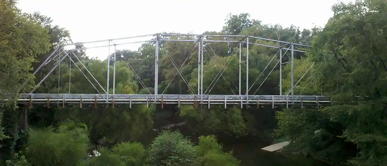 The Deep River Camelback Truss Bridge is a steel camelback truss resting on stone and concrete piers, with a macadam road surface covering a plank deck. Read more on Wikipedia