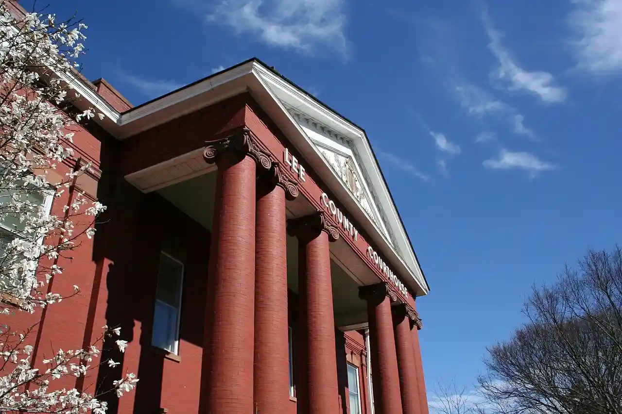 Lee County Courthouse is a historic courthouse located at Sanford, Lee County, North Carolina. It was built in 1908, and is a two-story rectangular brick building in the Classical Revival style. The east and west sides features monumental hexastyle porticoes supported by Ionic order brick columns. Atop the hipped roof is a small dome. Read more on Wikipedia