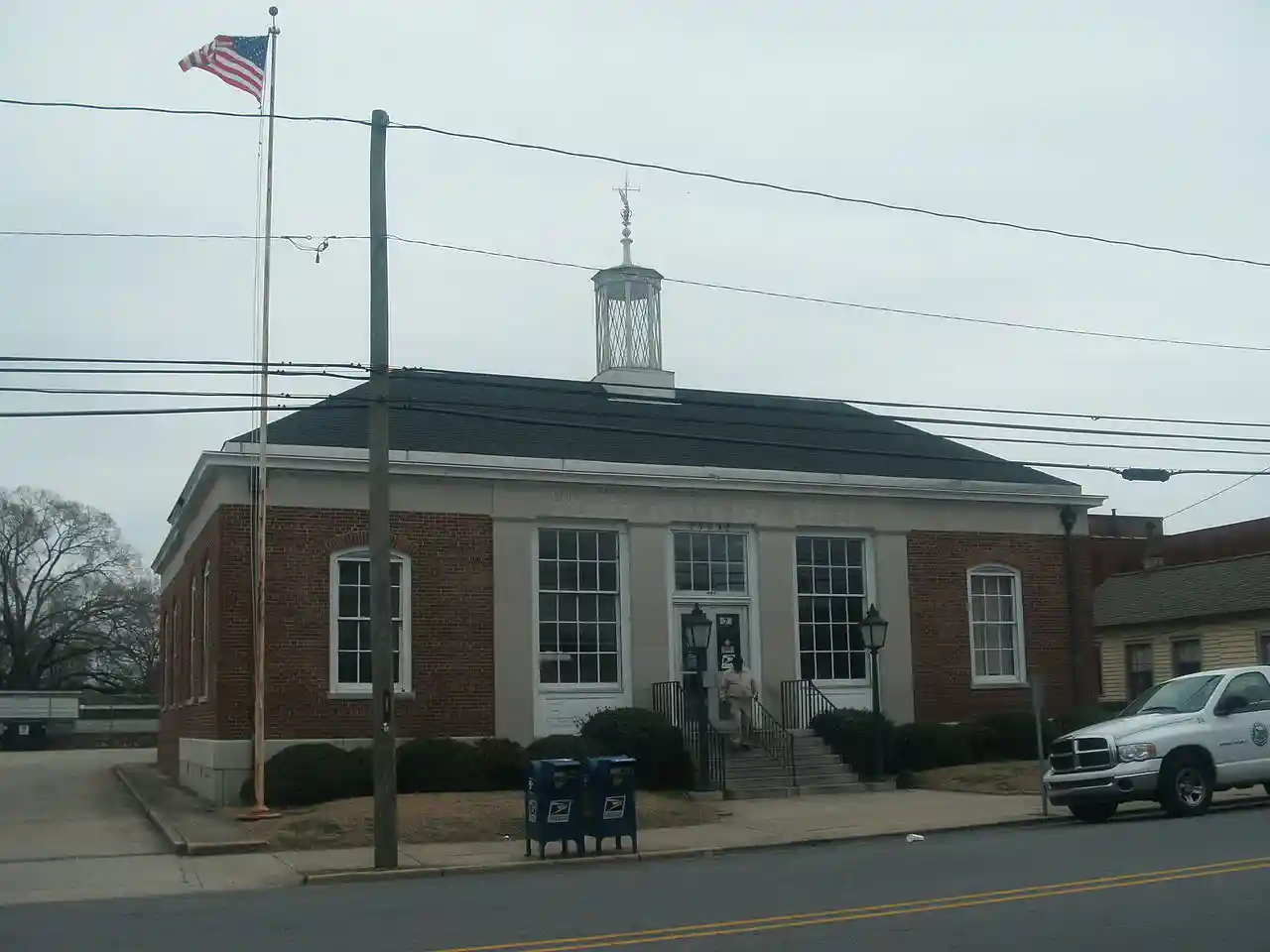 Williamston Commercial Historic District is a national historic district located at Williamston, Martin County, North Carolina. The district encompasses 31 contributing buildings in the central business district of Williamston. They include notable examples of Greek Revival, Colonial Revival, and Romanesque architecture in buildings dated from the mid-19th century through the 1920s. Located in the district is the separately listed Martin County Courthouse. Other notable buildings include the Docton W. Bagley Building (c. 1850), (former) People's Bank (1917), Watts Theatre (1929/1940/c. 1968), the Tar Heel Apartments (1921), the Flatiron Building, and the United States Post Office (1938). The post office contains a mural, First Flight of the Wright Brothers at Kitty Hawk, by Philip von Saltza, painted in 1940 as part of the Works Project Administration's mural project. Read more on Wikipedia