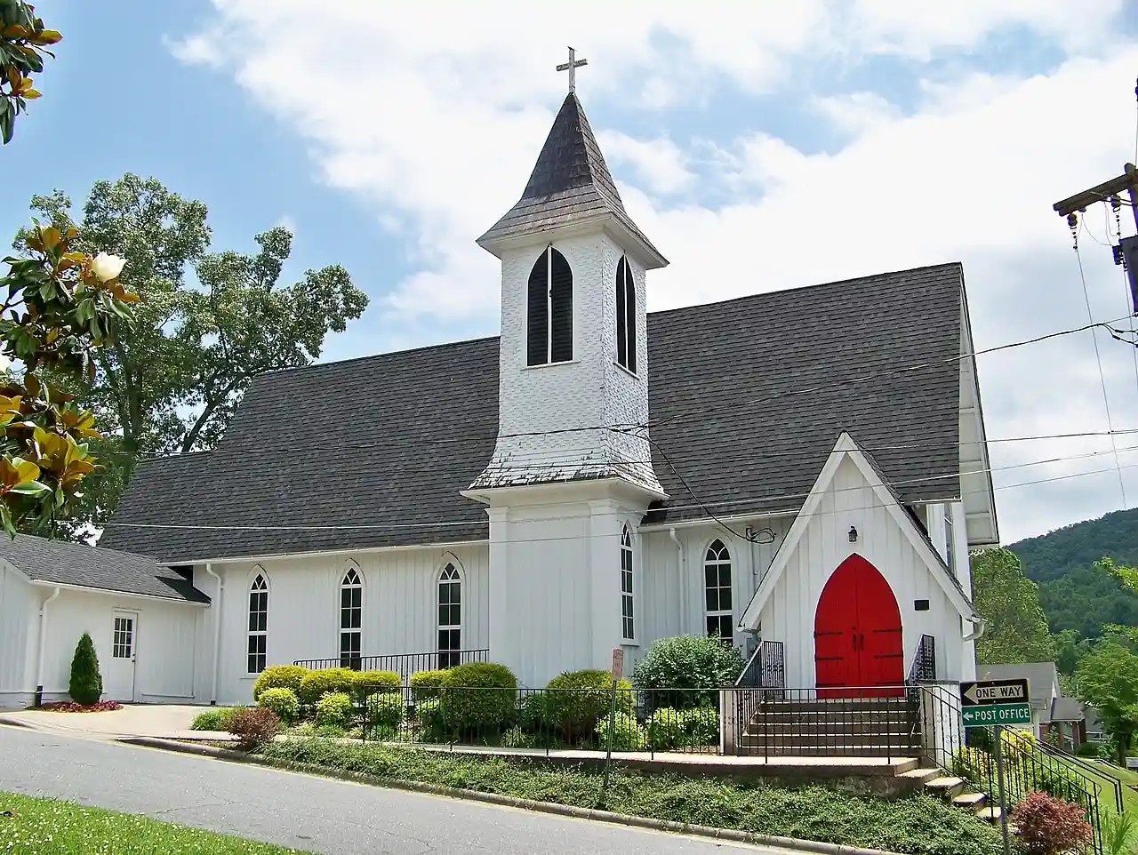 St. John's Episcopal Church is a historic Episcopal church located at 315 S. Main Street in Marion, McDowell County, North Carolina. It was built in 1883, and is a one-story, Carpenter Gothic style frame church. It has a steeply pitched gable roof, board and batten exterior walls, lancet windows, and an elaborate bell tower added in 1903. St. John's is one of the few buildings that survived the 1894 fire on Main Street. St. John's Episcopal Church is a vibrant spiritual Community with roots formed more than a Century ago. Read more on Wikipedia