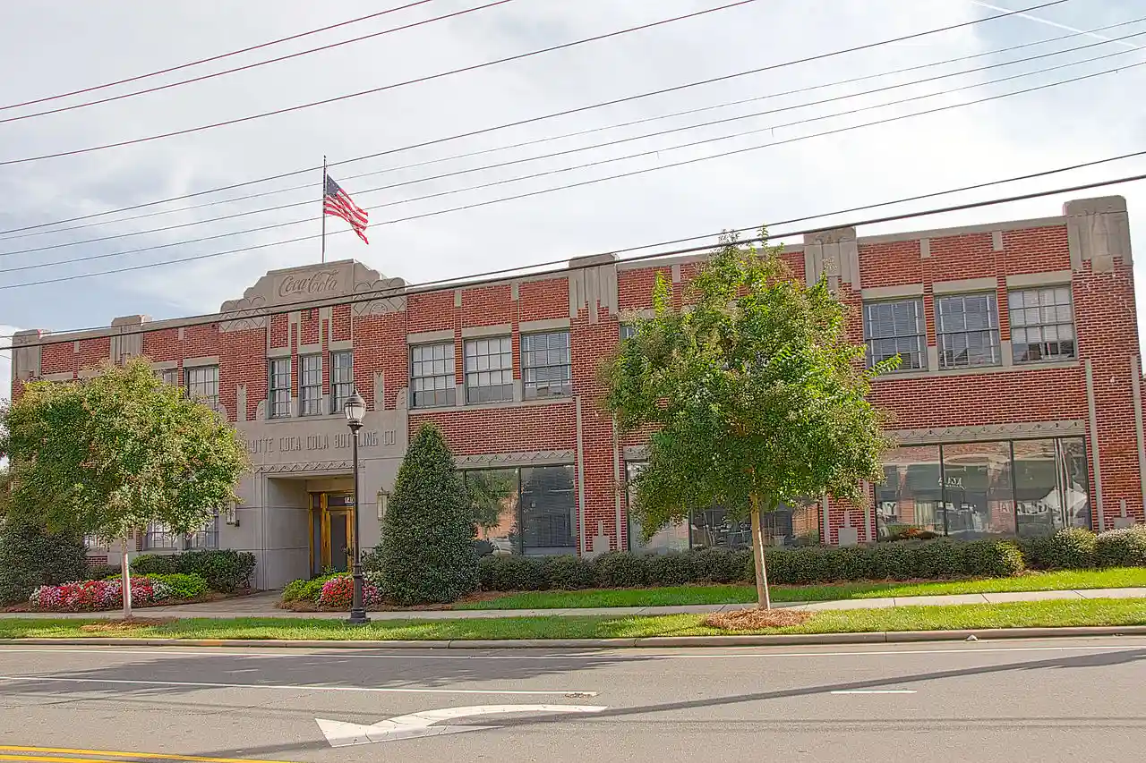 Former Charlotte Coca-Cola Bottling Company Plant is a historic Coca-Cola bottling factory building located at Charlotte, Mecklenburg County, North Carolina. It was built in 1929–1930, and is a two-story, reinforced concrete building with a red brick veneer and decorative concrete detailing and Art Deco design elements. The building has a rectangular plan measuring 110 feet by 185 feet, parapet, and Coca-Cola bottles, sculpted of precast concrete, which crown the corner pilasters. Read more on Wikipedia
