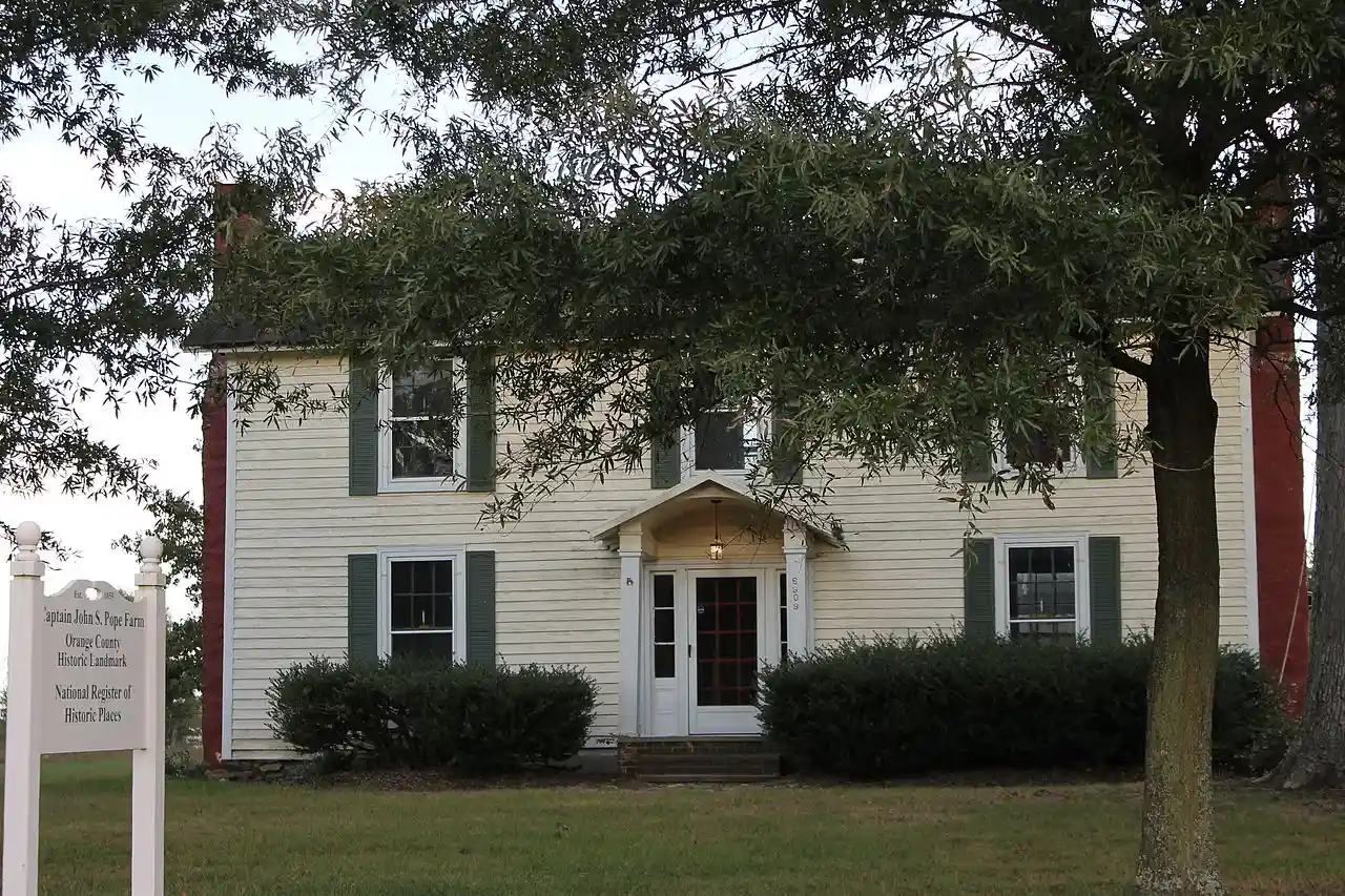 Capt. John S. Pope Farm is a historic tobacco farm complex located near Cedar Grove, Orange County, North Carolina. The farmhouse was built between 1870 and 1874, and is a two-story, frame I-house with a one-story ell. It sits on a stone pier foundation, has a triple gable roof, and features stone gable end chimneys. Also on the property are the contributing well house (c. 1920), washhouse (c. 1875, 1930s), garage / smokehouse (c. 1900, c. 1920), flower house (c. 1900), two corn cribs (c. 1900, c. 1930), feed barn (c. 1900), tobacco ordering/stripping house (c. 1935), two curing barns (c. 1955), stick shed (c. 1950), five tobacco barns (c. 1875-1955), a spring-fed well (c. 1909), workshop (c. 1960), a small log building (c. 1880), two wood sheds (c. 1920, c. 1950), and the surrounding agricultural landscape. Read more on Wikipedia