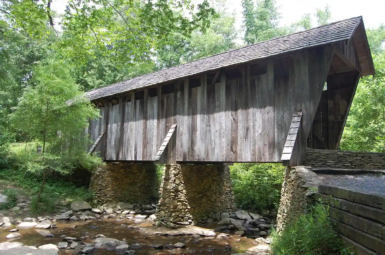 Pisgah Covered Bridge is a wooden covered bridge that spans the west fork of the Little River in Randolph County, North Carolina. It is one of two remaining original historic covered bridges in the state, (the other being the Bunker Hill Covered Bridge in Claremont, North Carolina) and is designated as both a local and federal historic landmark. Read more on Wikipedia